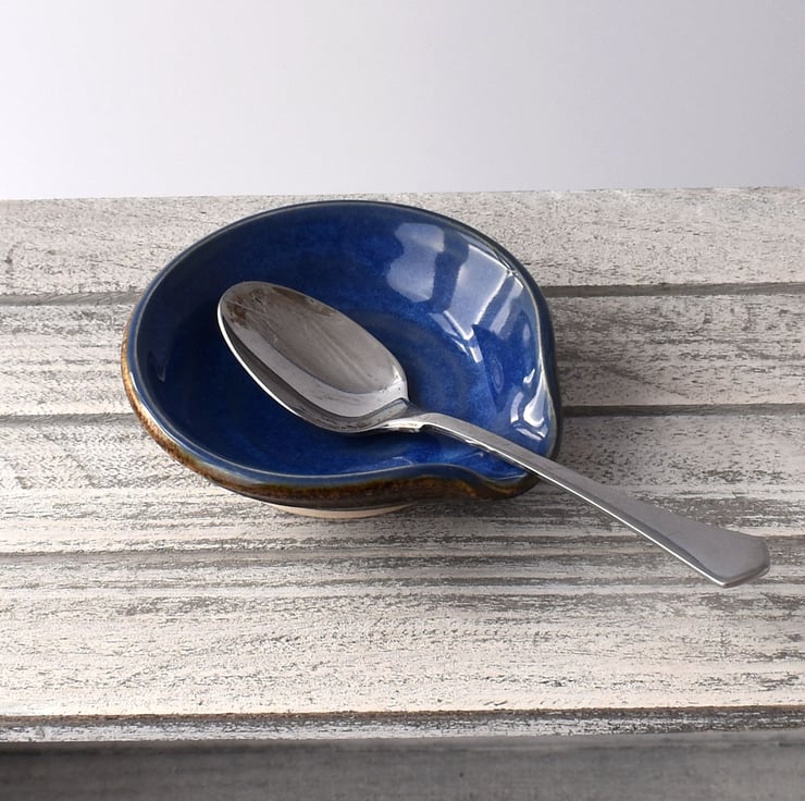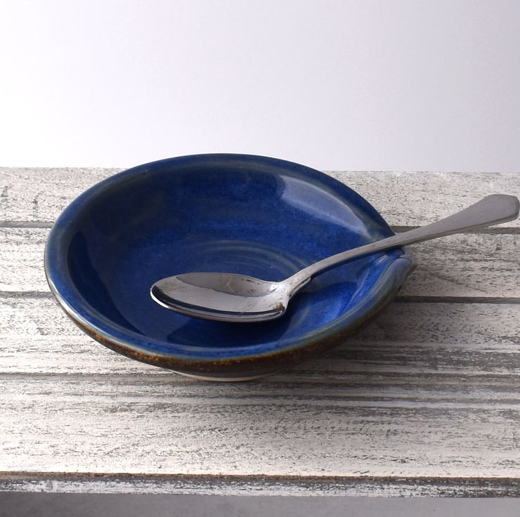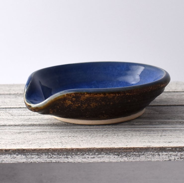 Wheel thrown handmade pottery tea bag receptacle or tea spoon rest in blue and brown glazes.