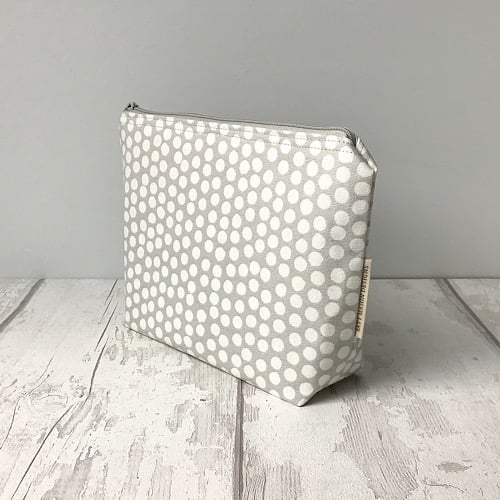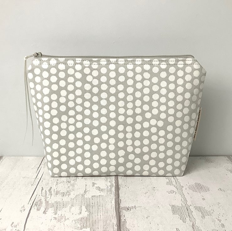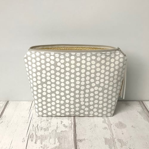 Pretty make-up or useful things bag in an grey spot fabric. Fully lined in yellow spot fabric. 17.5cm wide at bottom, 24cm wide at top, 15.5cm high, 7cm deep at base. Please note, there might be a slight difference to the pictures shown due to the pattern repeat of the fabric.