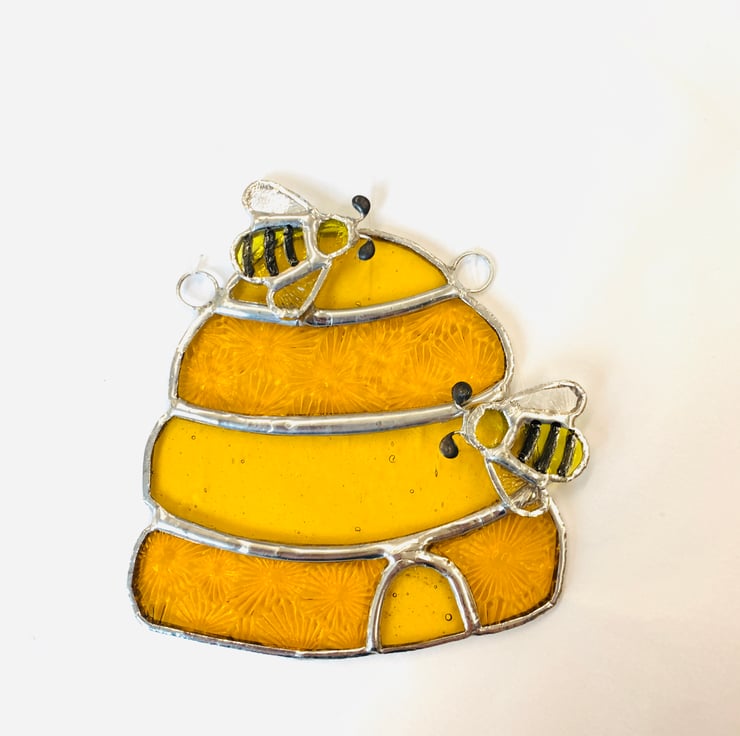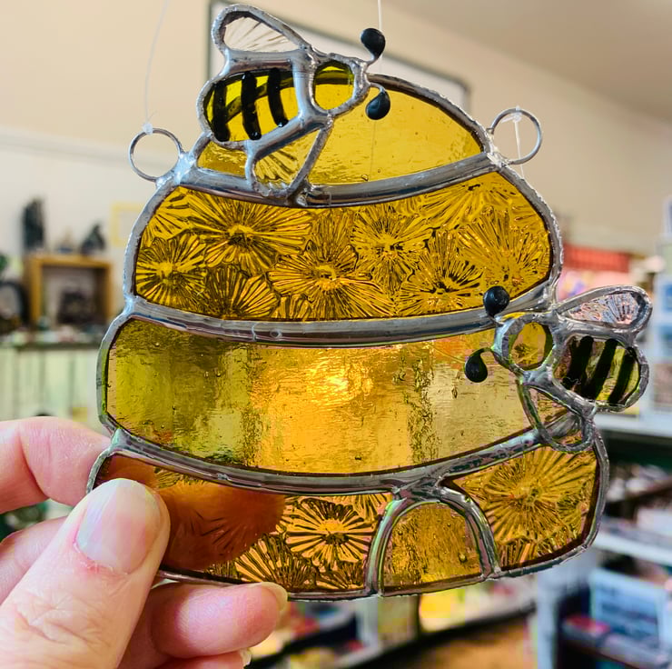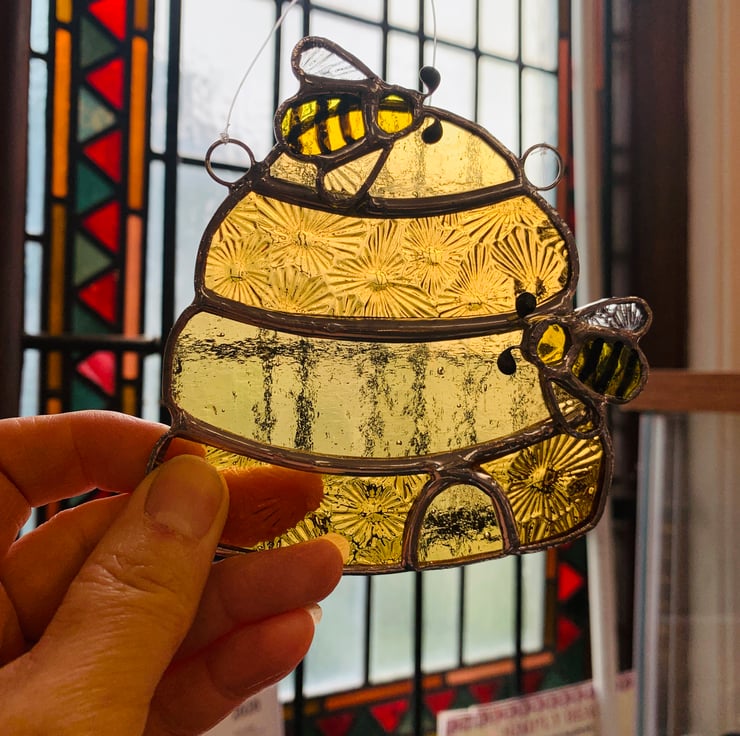 Each piece of glass has been hand cut, ground, foiled and soldered before being washed and polished. The stripes on the bees have been made with glass paint and the eyes blackened with patina. Yeo rings and a length of line has been attached for hanging purposes.