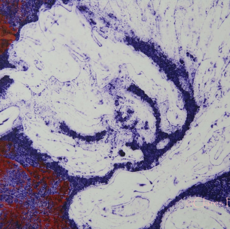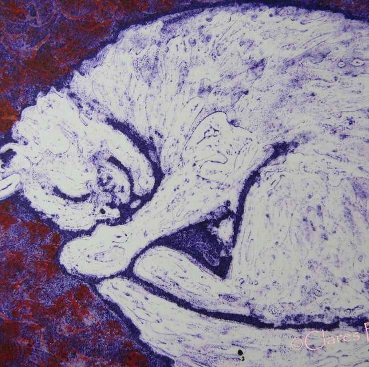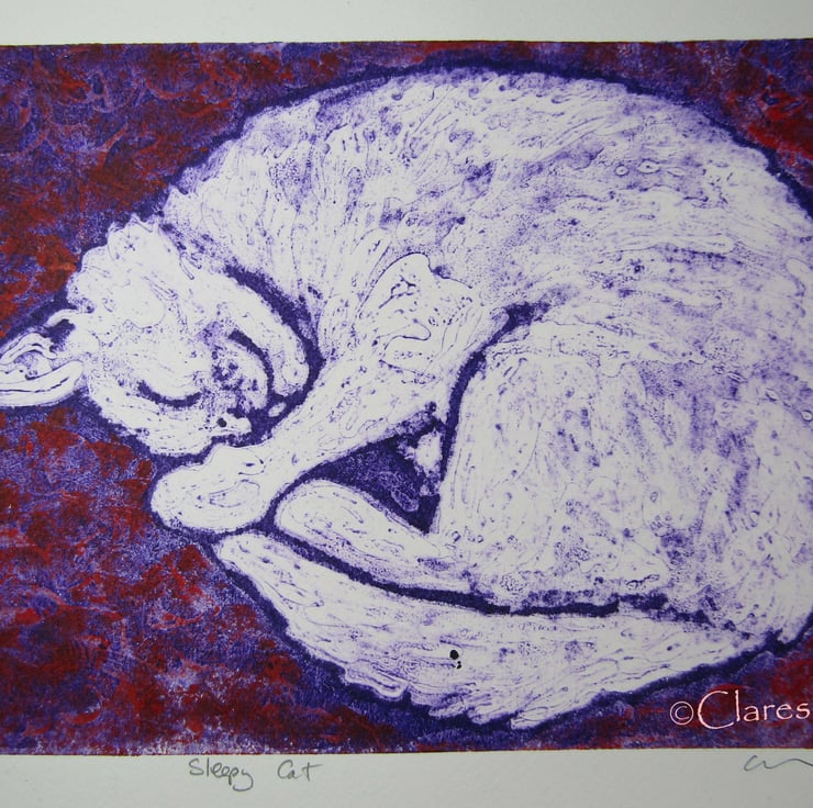 Hand printed on 300gm acid free watercolour paper in purple oil based ink with red/purple background.