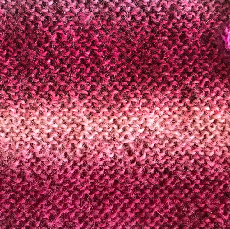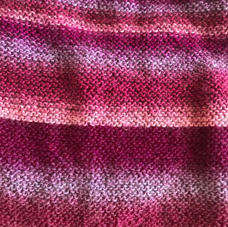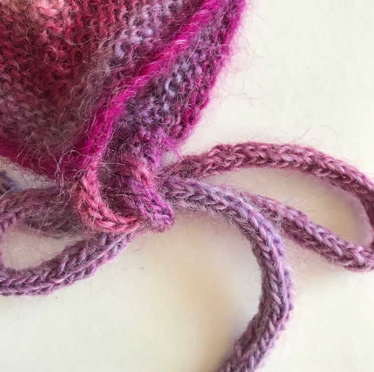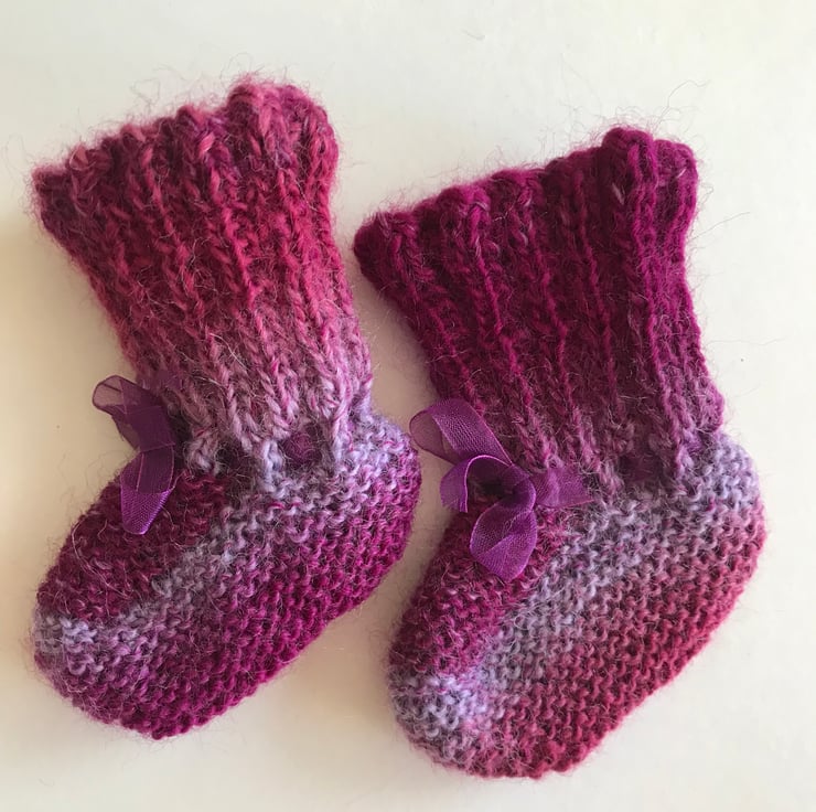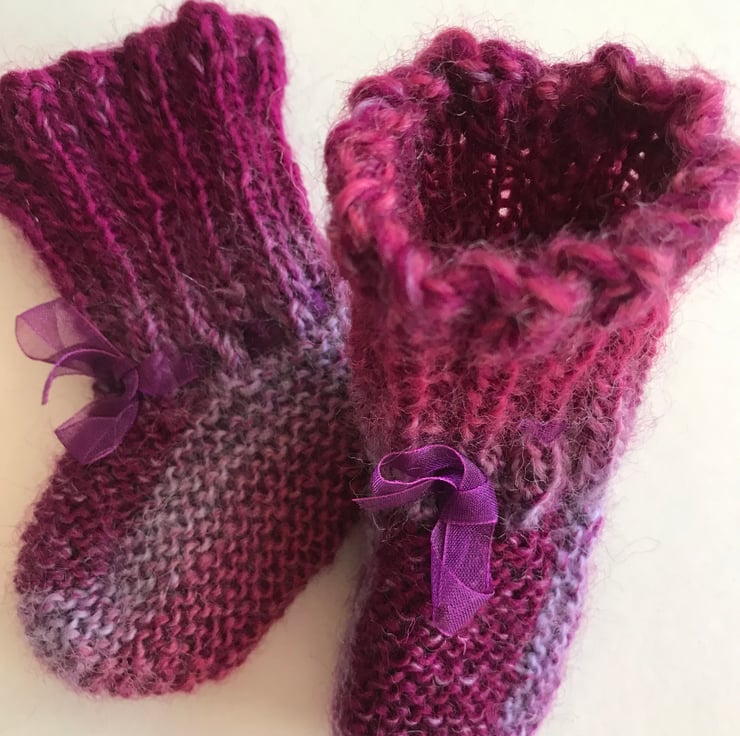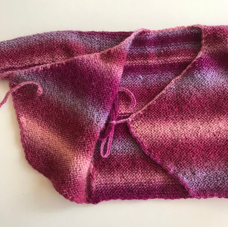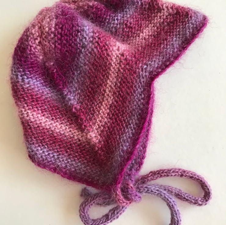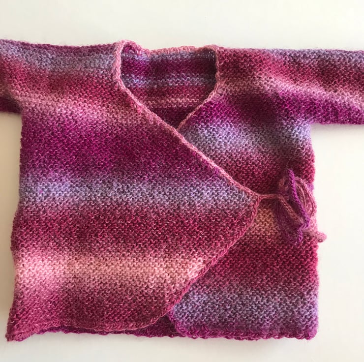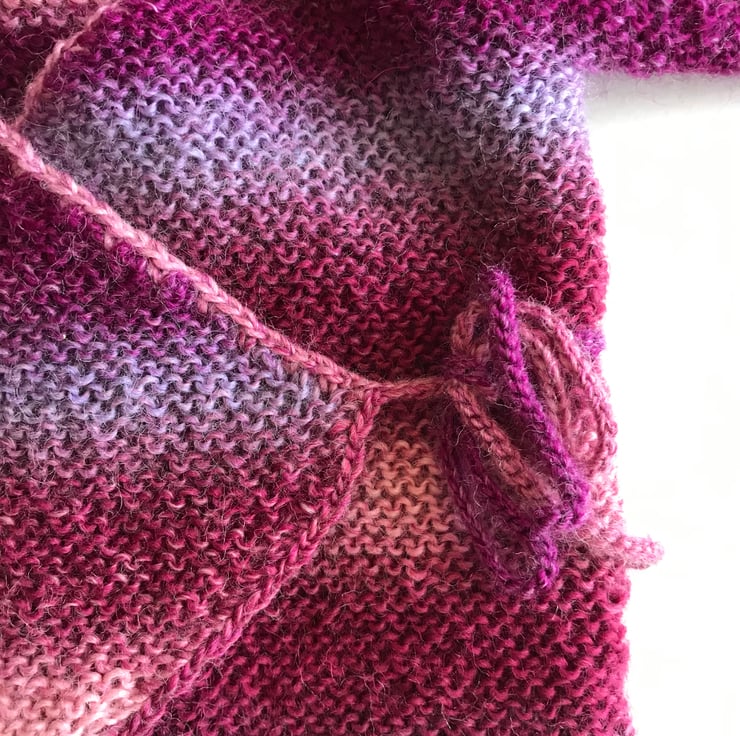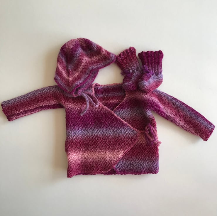This unusual hand knitted cardigan is worked in a self striping yarn. The colours vary from pale pink to magenta. The cardigan crosses over at the front forming a v-neck and fastens with knitted ties. The sleeves can be folded over to form a cuff. The hat is petal shaped and also fastens with knitted ties. The bootees have a ribbed cuff and are thread with ribbon.