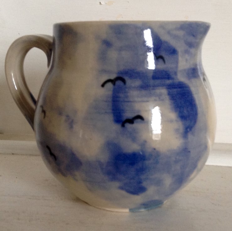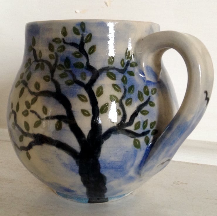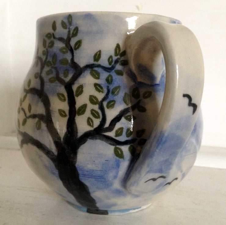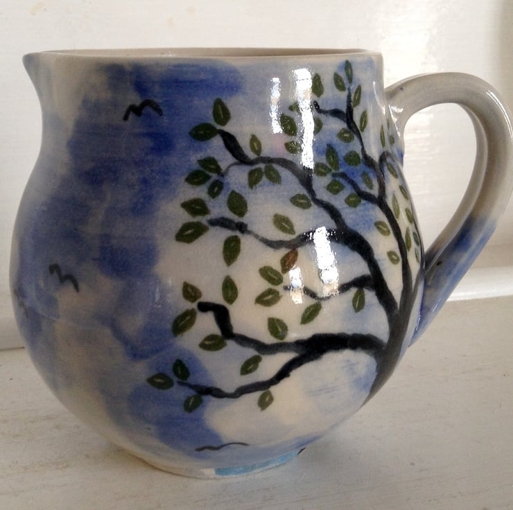 Beautiful little handthrown jug in cream stoneware clay. The jug is hand thrown and hand painted with a tree and sky design and measures 10 cms high and 9.5 cms across at widest point. It holds 1/2 litre and is dishwasher and microwave safe.