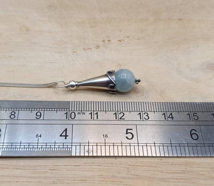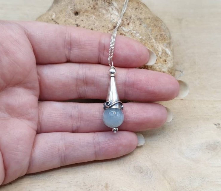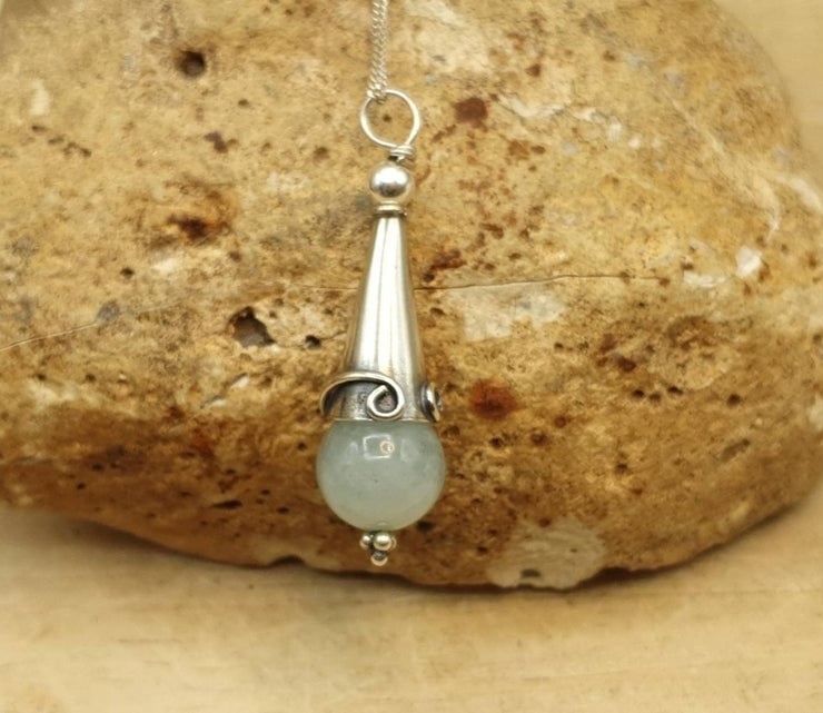 This is a women's silver Aquamarine cone pendant necklace. I have made this with Bali silver beads which are handmade beads by the world renown silversmiths of Bali and contain up to 99% silver. Bali silver is not hallmarked or stamped.