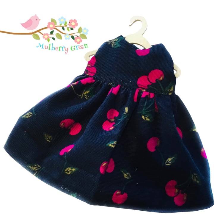 A navy blue corduroy dress with a really pretty cherry pattern to fit the Mulberry Green dolls. The dress has a lined bodice and a gathered skirt and comes on a cute little wooden hanger.