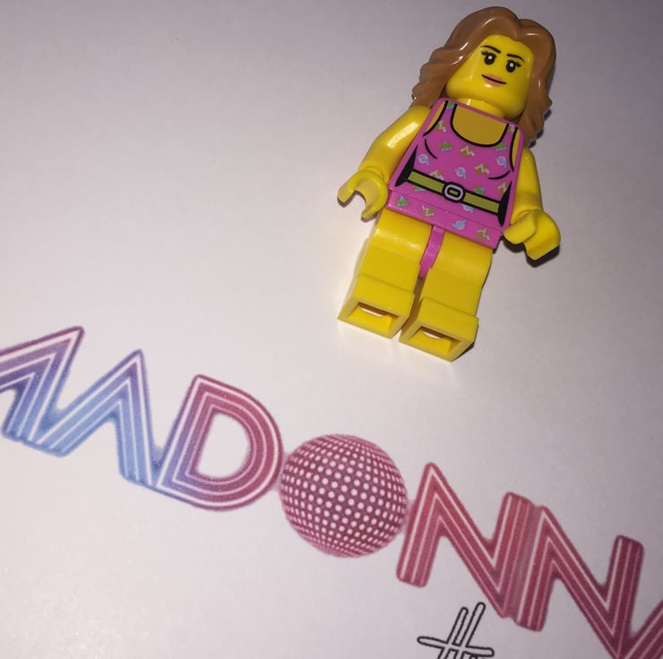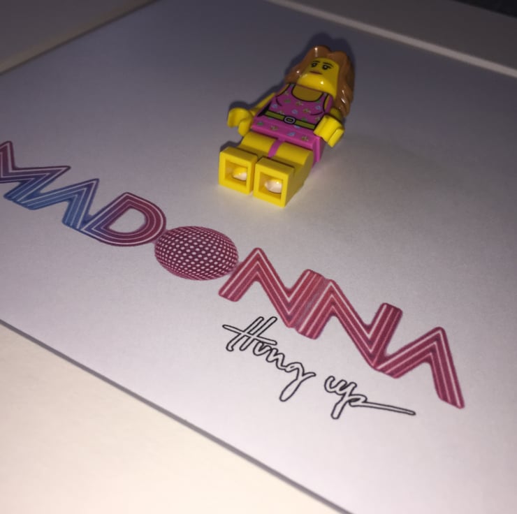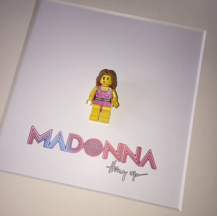 Our tribute to the original queen of pop comes in the form of a custom made Lego minifigure. We have mounted this little lady in to a deep box frame and teamed her alongside the iconic logo.