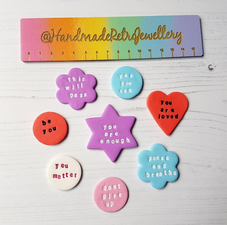 These are handmade affirmation tokens, made using polymer clay. Each one is completely different and unique, with the phrase being hand stamped into the clay, cut out into a shape. After baking, the lettering is filled in with paint, carefully hand painted by myself, to stand out.