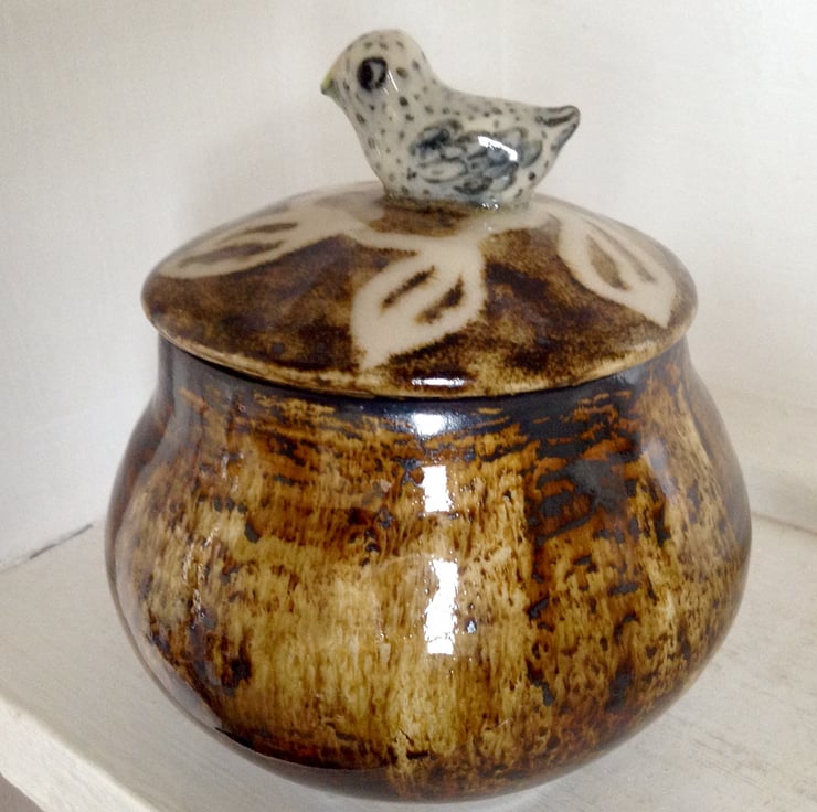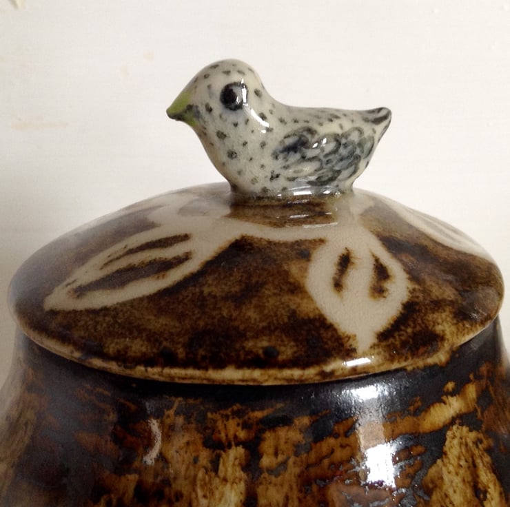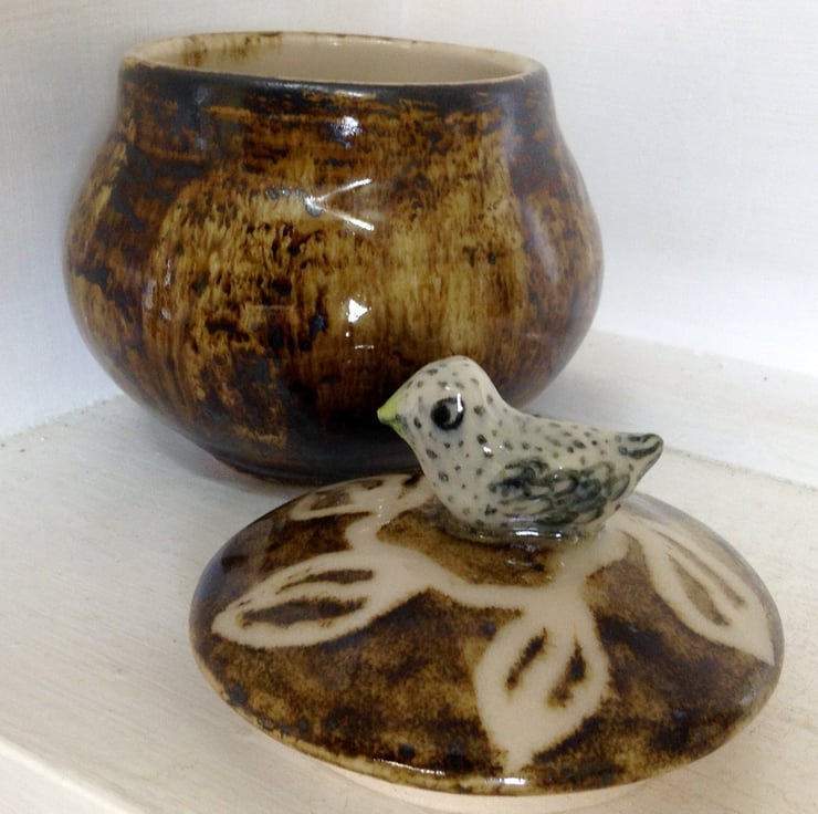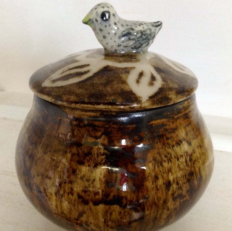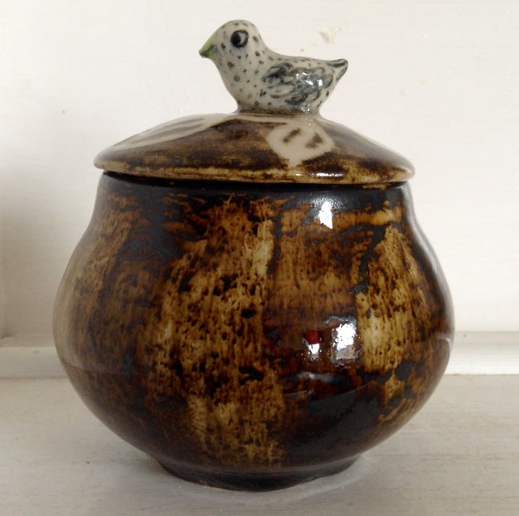 Very cute hand thrown lidded jar with a little hand modelled bird on the lid. The lid is decorated with a very simple leaf design in brown iron oxide and the main body of the jar is a deep reddish brown. It measures 11.5 cms high and is 10 cms wide. It is dishwasher and microwave safe.
