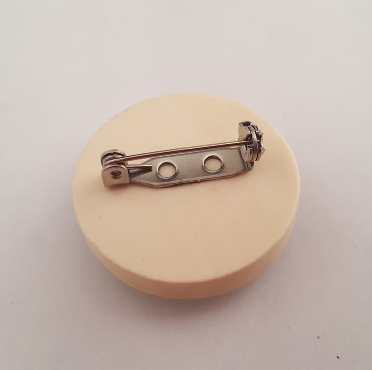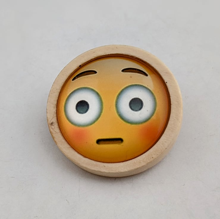 25mm emoji glass cabochon in a wooden brooch setting. In an organza gift bag.