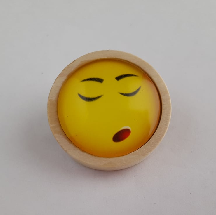 25mm emoji glass cabochon in a wooden brooch setting. In an organza gift bag.