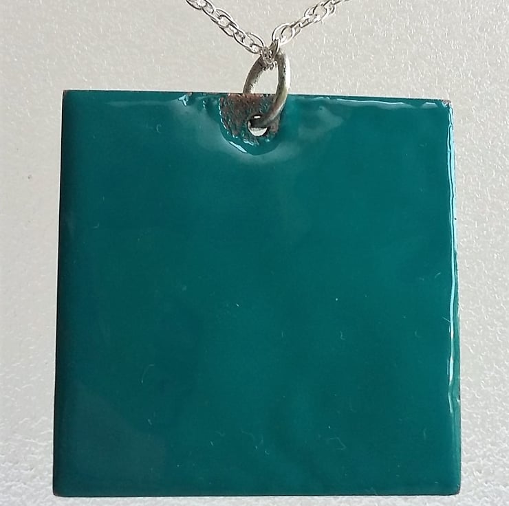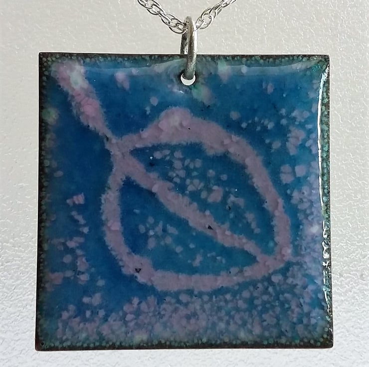 Square enamelled copper pendant in shades of blue with a lilac leaf outline. The pendant has been kiln-fired and measures approximately 30mm square. The back has been finished in glossy turquoise enamel. It comes complete with an 18” sterling silver rope chain with a soldered sterling silver jump ring and is supplied with a little organza pouch. POSTAGE IS FREE!