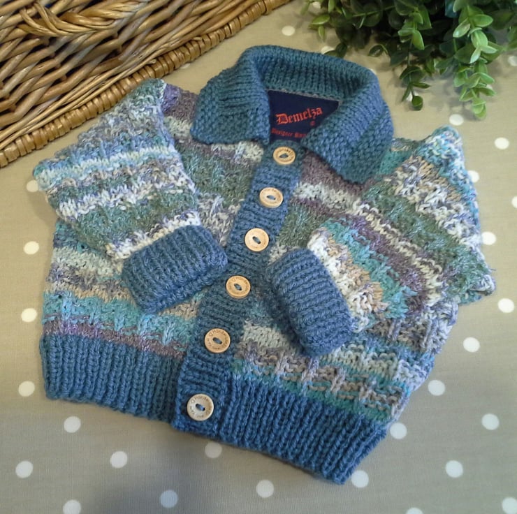 A lovely practical eye catching baby boy's cardigan lovingly designed and totally hand crafted. All yarns used are machine washable at low temperatures. The solid sage green yarn is a British manufactured premium acrylic. The multicoloured yarn has natural wool and cotton fibres mixed with acrylic fibres making the garment luxuriously softer and warmer. The buttons are made from genuine wood with a sweet sentiment burnt etched on them.