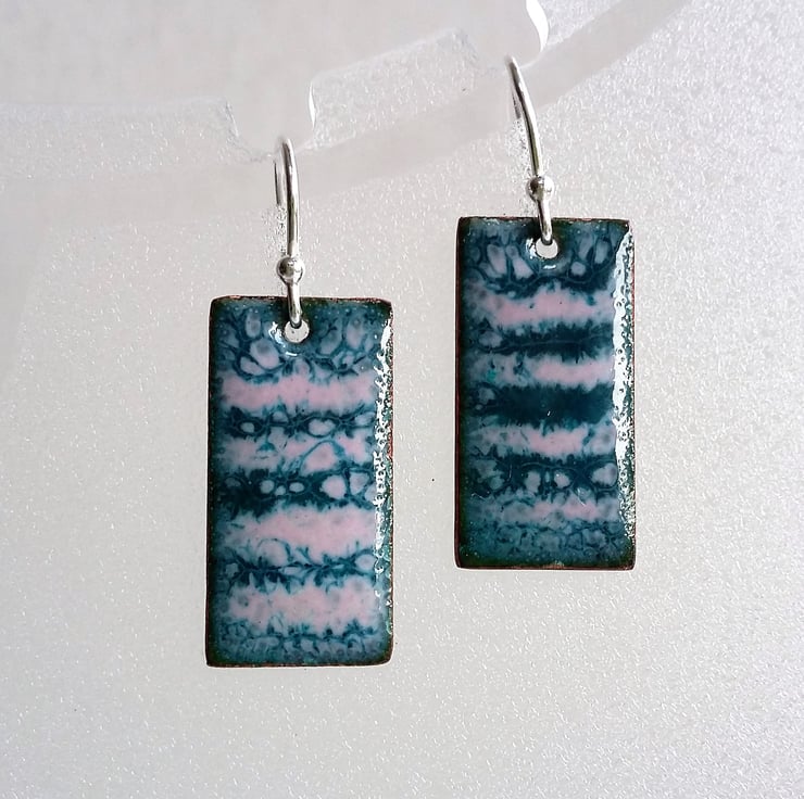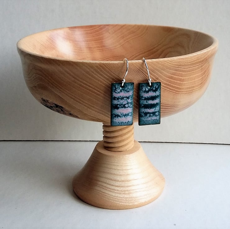 A subtle layering of opaque pink and transparent genoa blue enamels have given these earrings a batik-like pattern and the stripes complement the rectangular shape. Understated and elegant. The beautiful white oak pedestal bowl is, sadly, no longer available but my husband has many equally lovely pieces on Bluebell Woodturning here on Folksy.