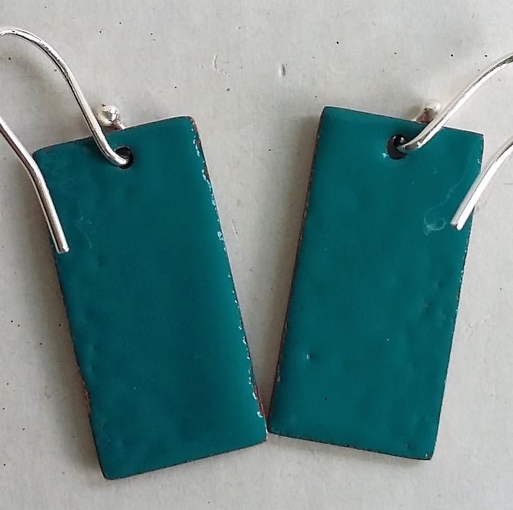 A pair of beautiful rectangular copper earrings in shades of sea blue and pink. The earrings have been kiln-fired and each measures 24mm x 12mm. The earrings come complete with sterling silver earring wires and the backs have been finished in glossy turquoise enamel. They are supplied with a little organza pouch and POSTAGE IS FREE!