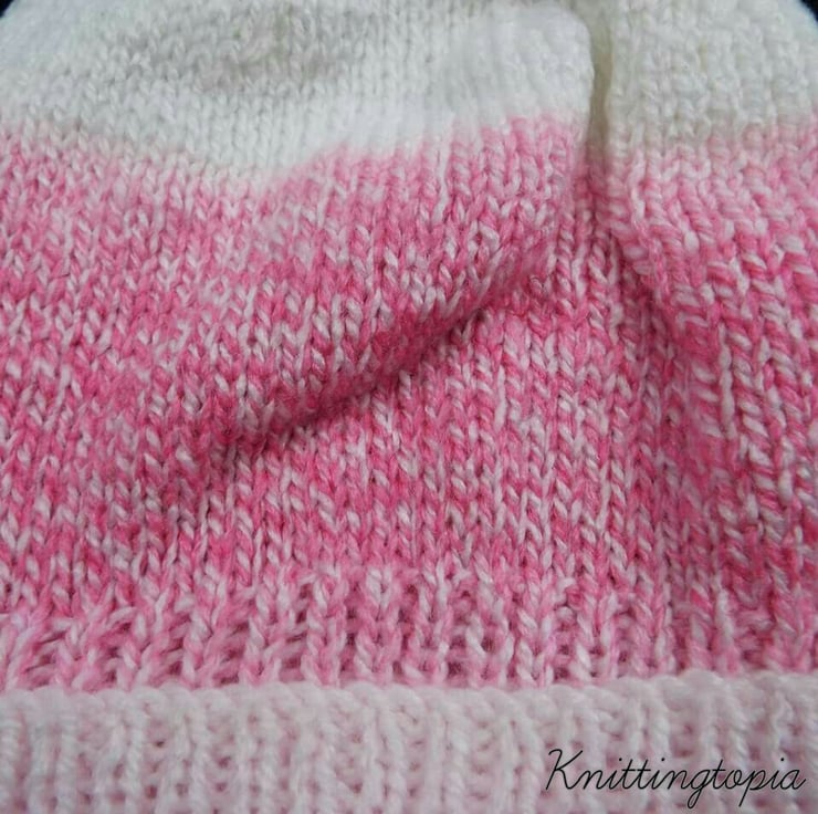 This beanie hat has been knitted using Hayfield Baby Changes which, as the name suggests, this is a 'colour phase' yarn. It subtly changes from white to pale pink then to a deeper pink entwined with white.
