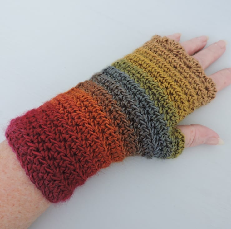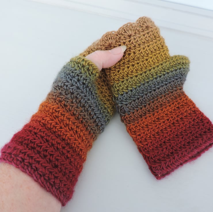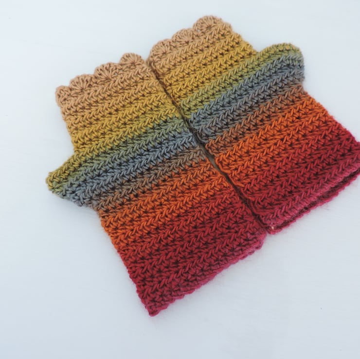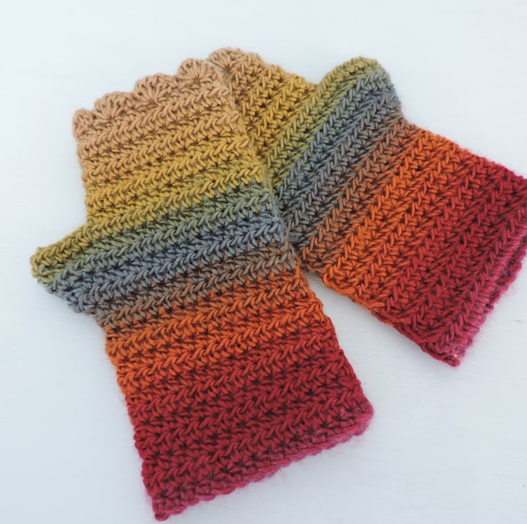 These fingerless mitts, wrist warmers, gloves have been crocheted using a self striping 100% acrylic yarn. Vibrant autumn colours graduating through mustard, red, orange, russet and slate blue. Wavy edged top and a plain body. A soft and warm winter warmer. Measurement from bottom to top is 7.5ins (19cm), with a circumference of 7ins (18cm).