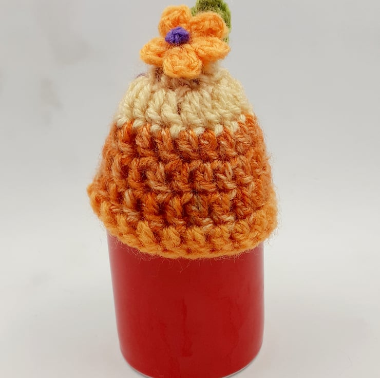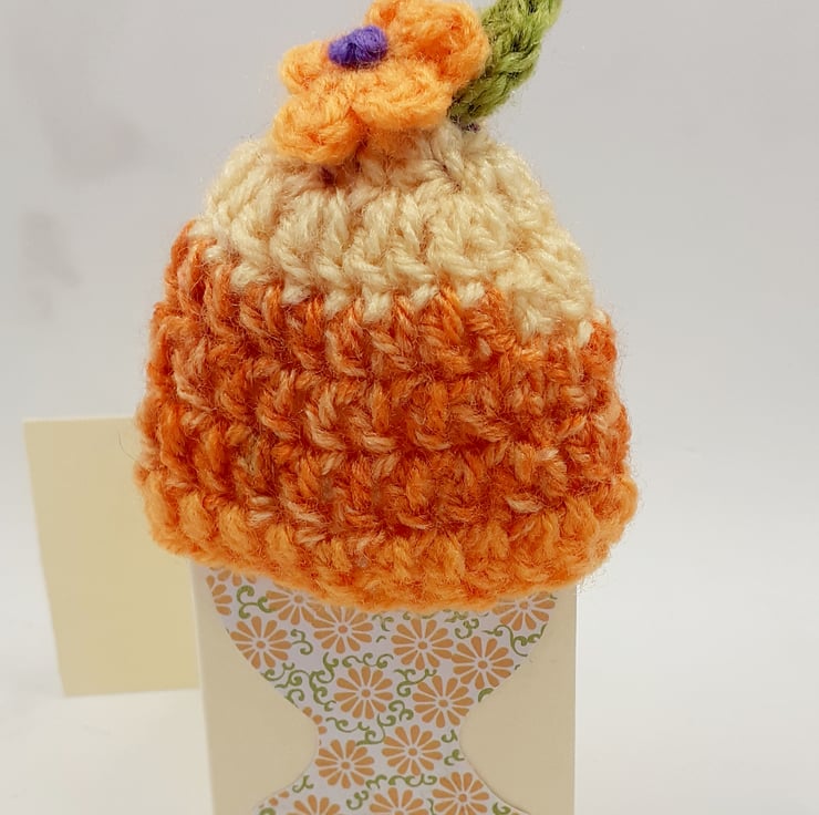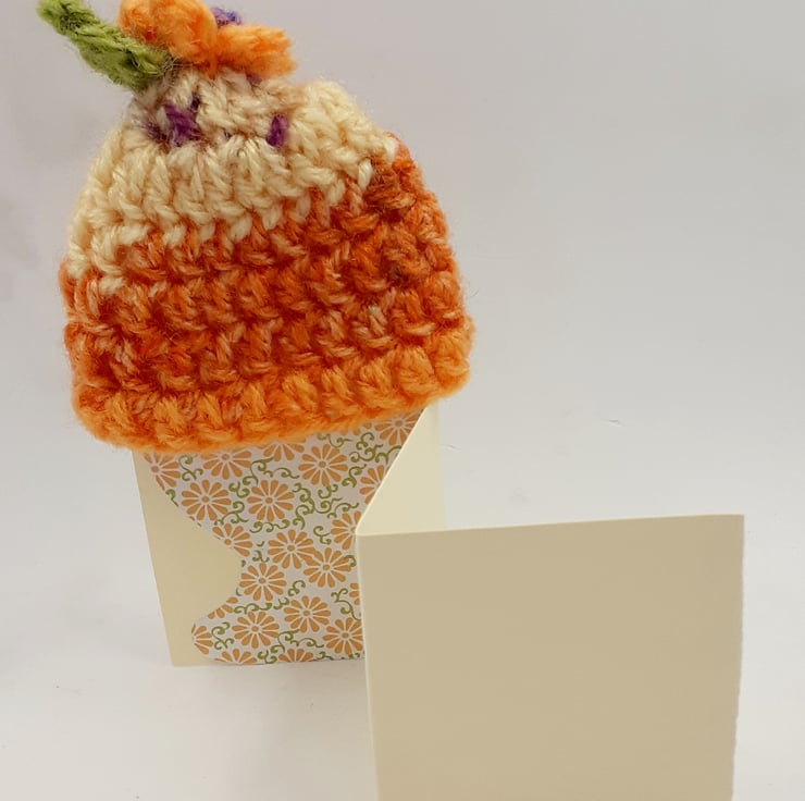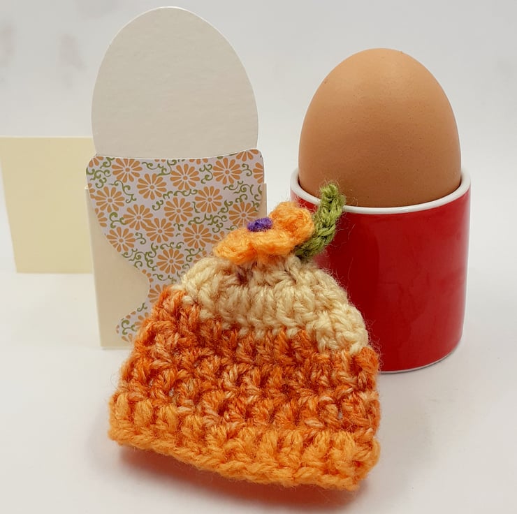 A novel Easter gift and card in one! The egg cosy is crocheted in cheerful acrylic yarns and sits atop a hand cut cardboard egg inside an egg cup cut from a pretty decorative paper. The zig zag card is left blank for your own Easter greeting.