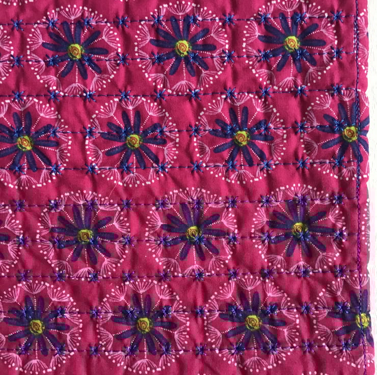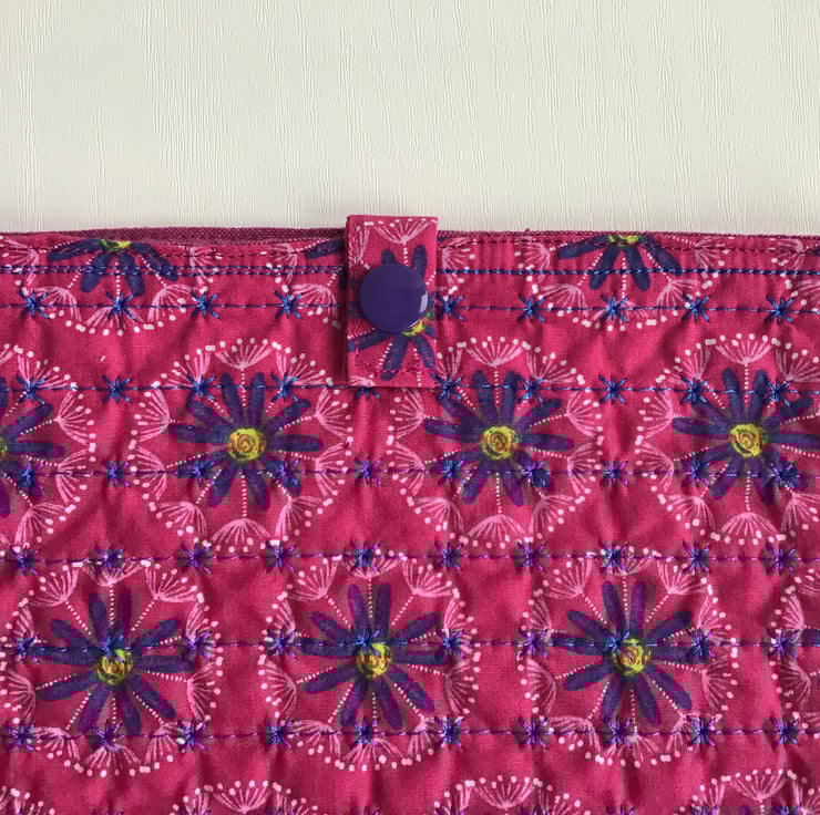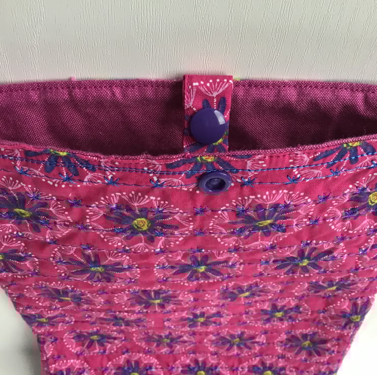 Fully Lined Pink and Purple Flower design quilted case with a Matching purple popper fastening. A pink fabric has been used for the lining.