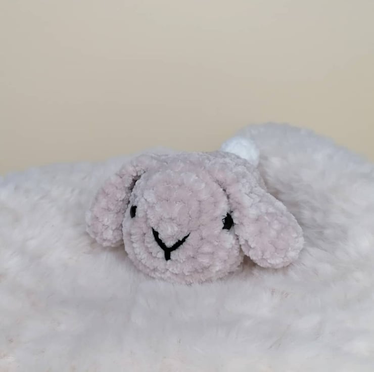 This adorable little bunny is looking for a new home. She's soft and cuddly, and she is made with supersoft polyester chenille yarn and stuffed with polyester stuffing. She has plastic safety eyes and a cotton embroidered nose (and the cutest floppy ears!).