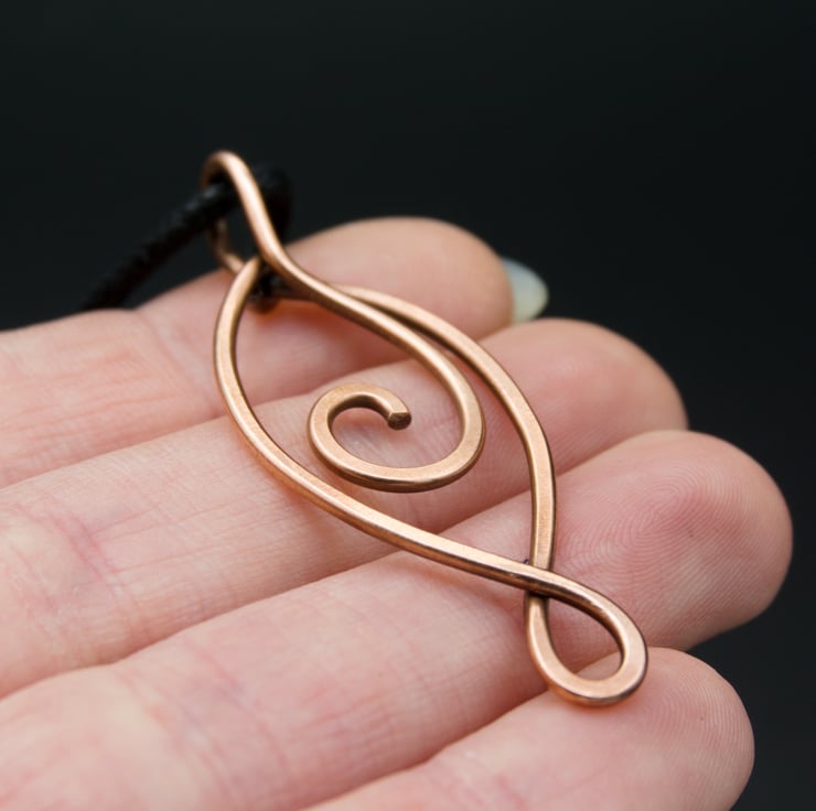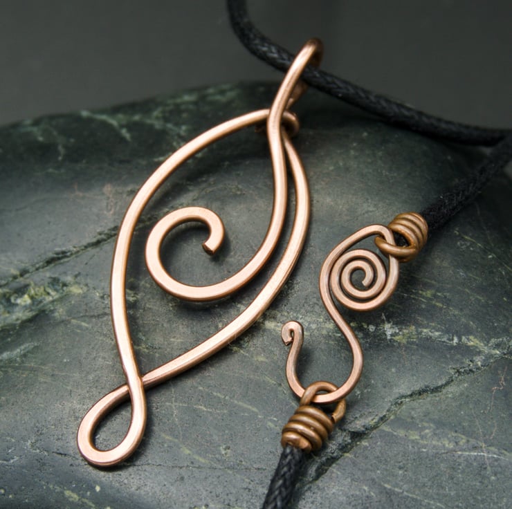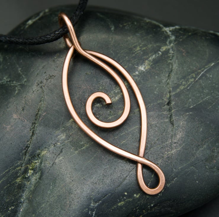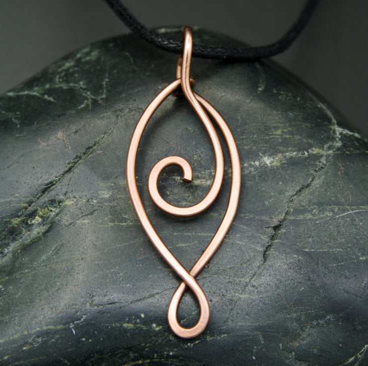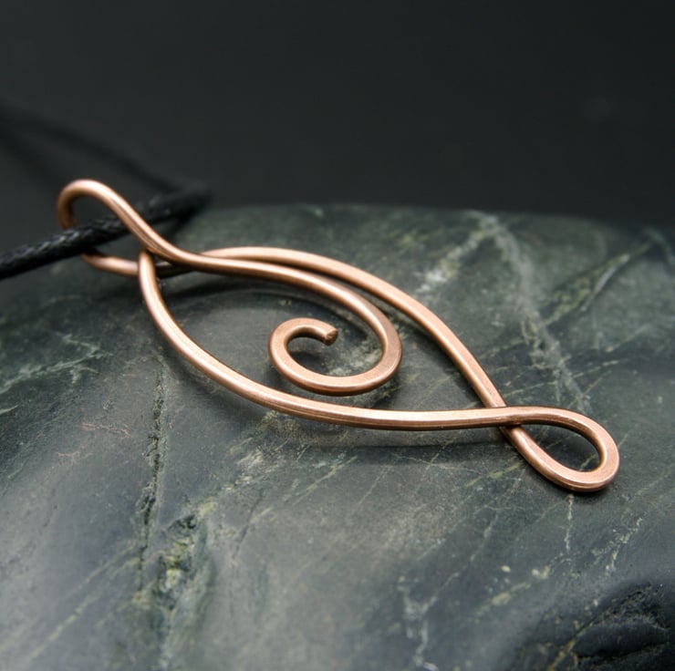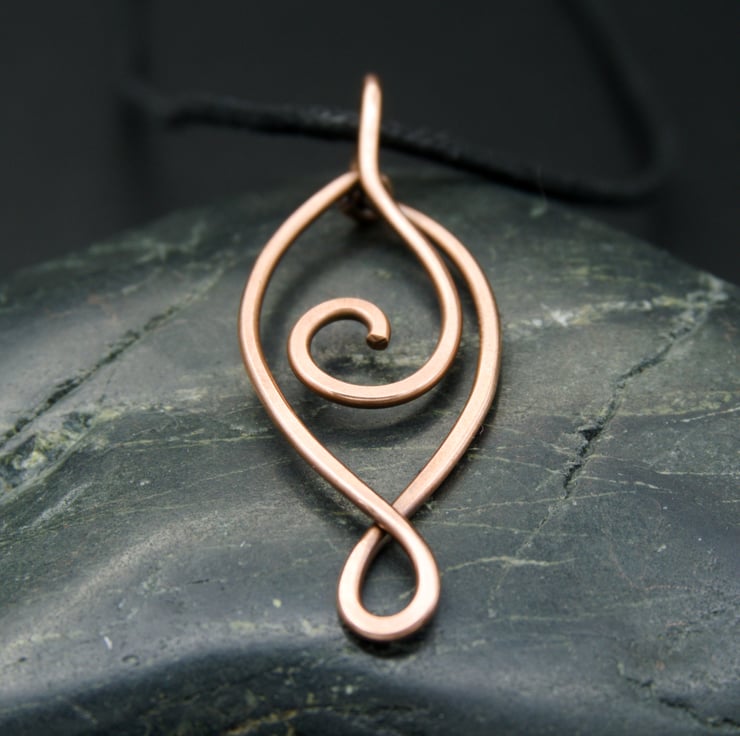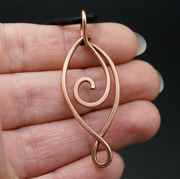 This simple pendant has been formed from a single length of copper wire. A central spiral sits inside an oval frame, with a loop at the bottom of the pendant. The whole shape has been hammered flat, then oxidised & polished to a lovely shine.