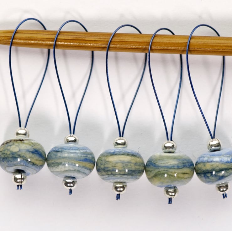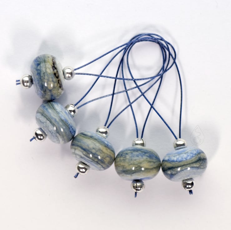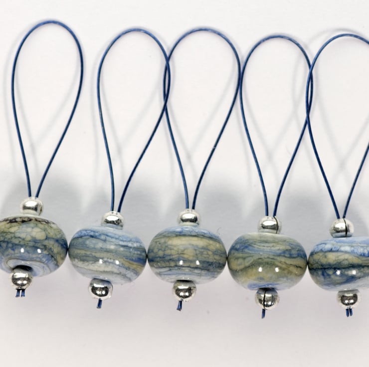 A set of 5 stitch markers made with lampwork glass beads in swirly pale blues and beige.
