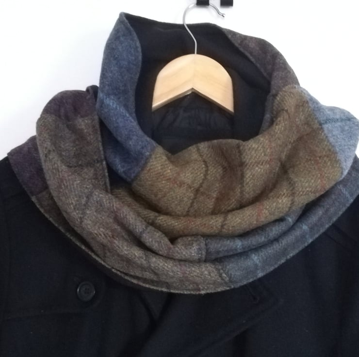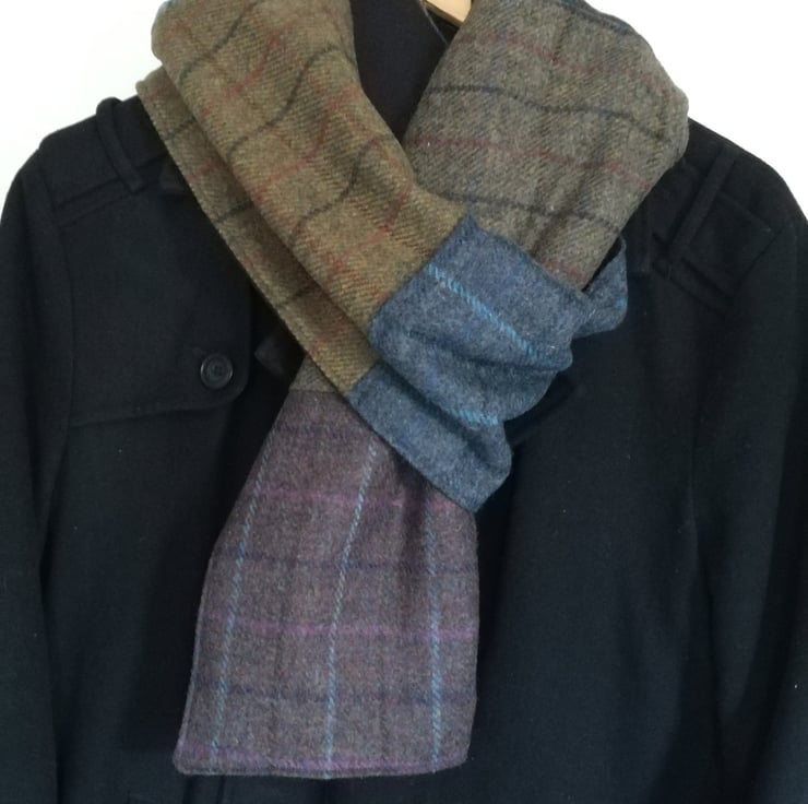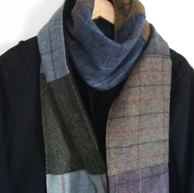 Luxury Scottish Tweed scarf, Handmade Patchwork wrap, Preppy style, Hipster scarf, Polar fleece lined, Warm winter wear, Green & blue Plaid scarf, Extra Long scarf, OOAK wool scarf, Gender neutral wool wrap, Steampunk scarf, Cold weather accessory