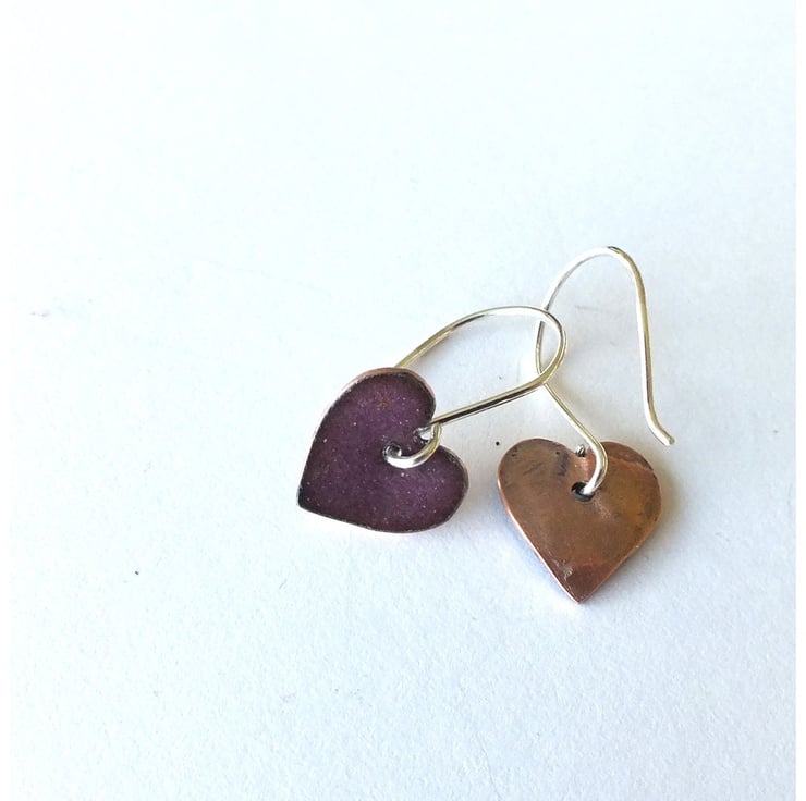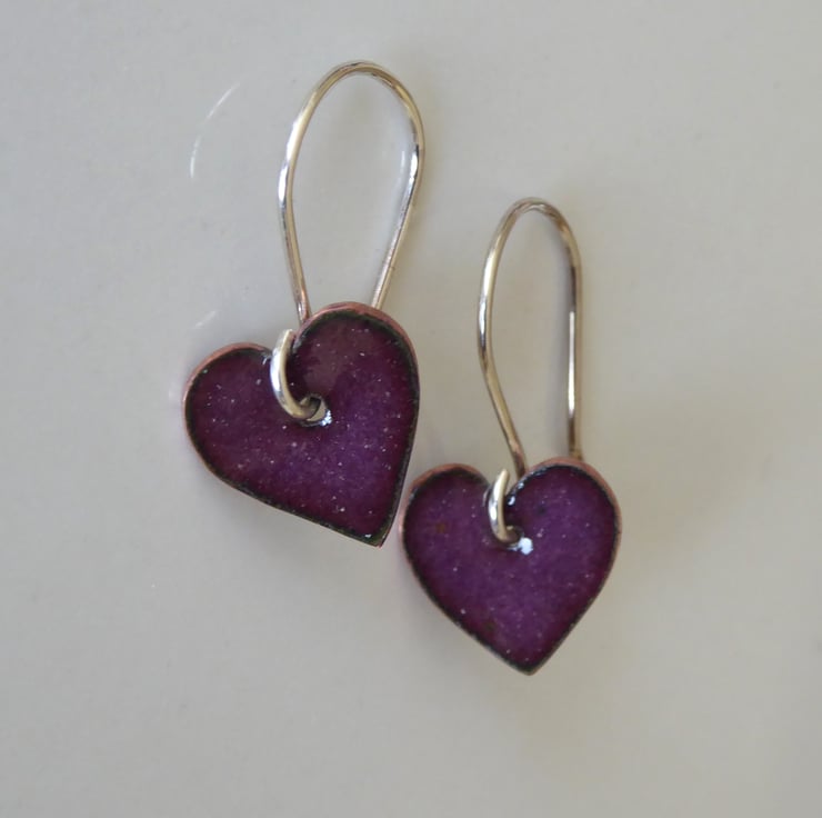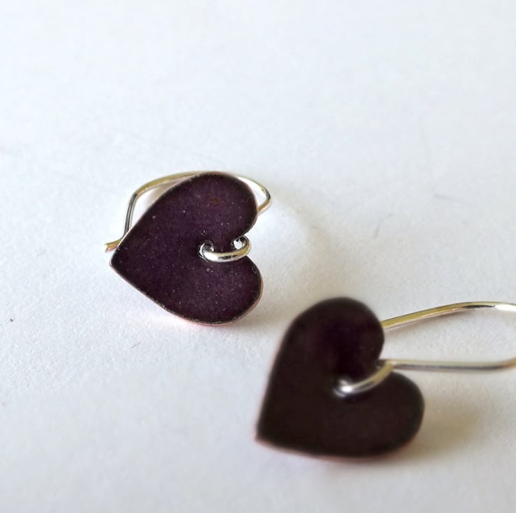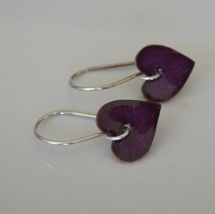 Dark purple enamelled heart shaped drop earrings, suspended from handmade sterling silver earring wires.