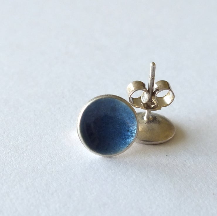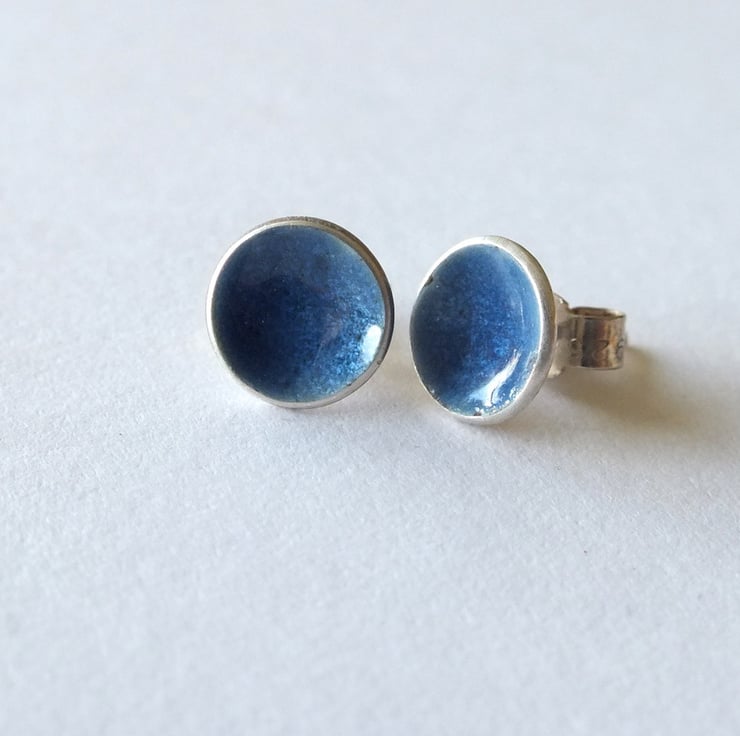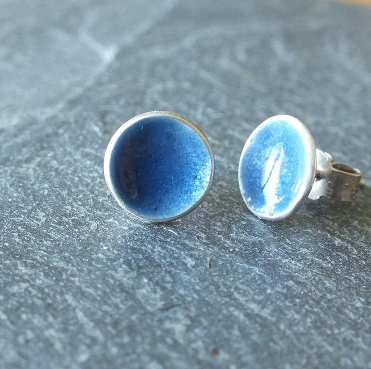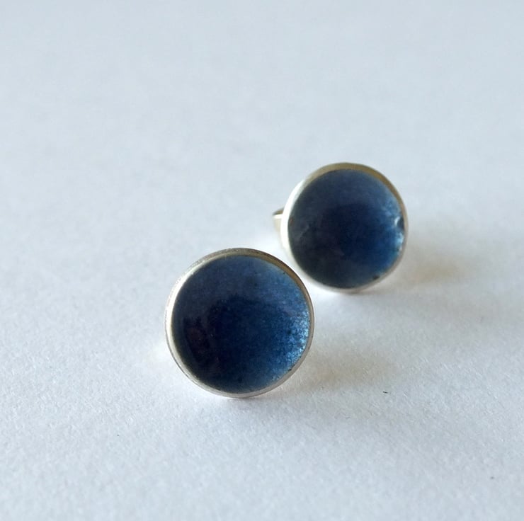 Slate blue coloured vitreous enamelled silver post earrings, approximately 8mm in diameter.