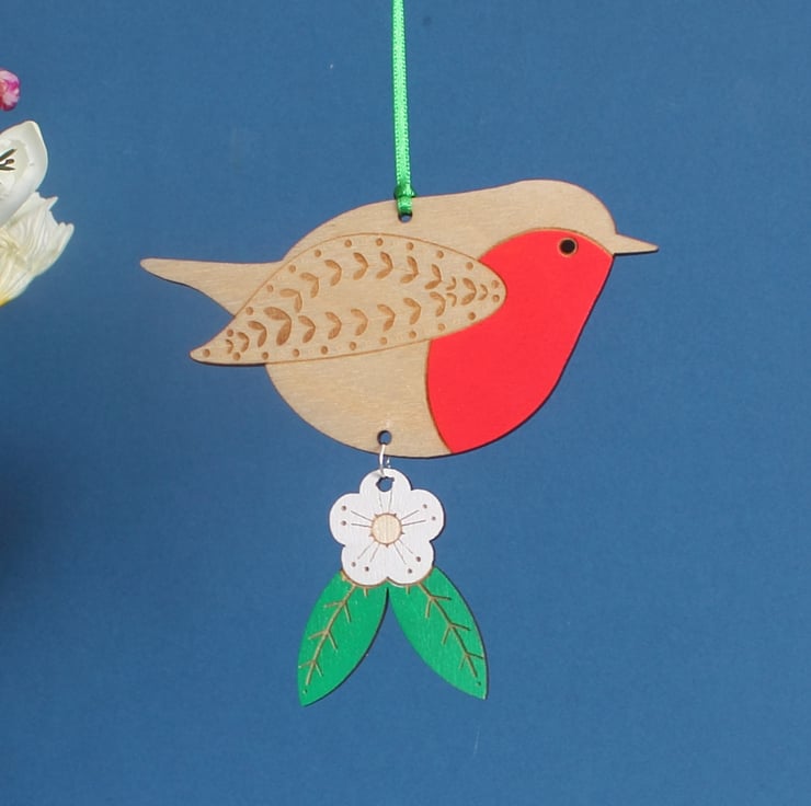He's cut and etched from 3mm birch ply and has a glossy, hand painted red breast. He also comes with either a little hawthorn flower with leaves or a holly sprig, which hang under his belly.