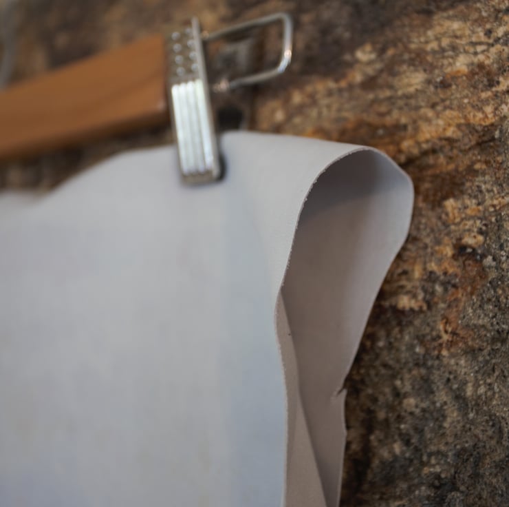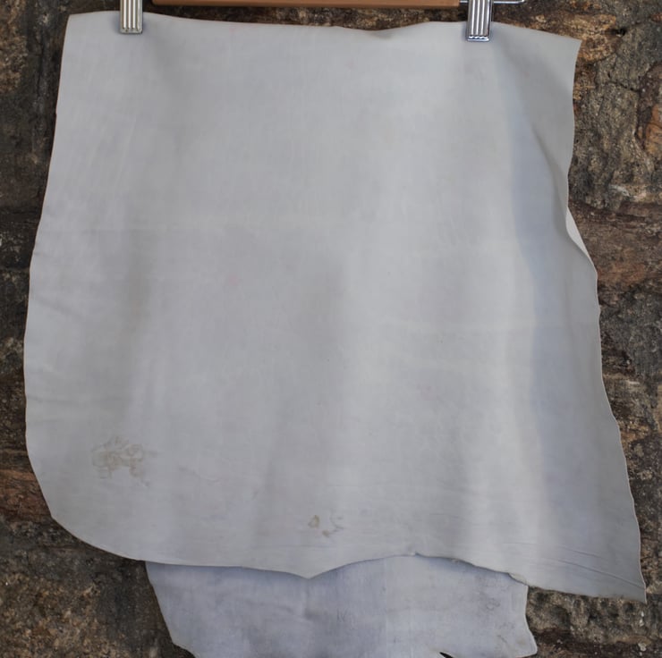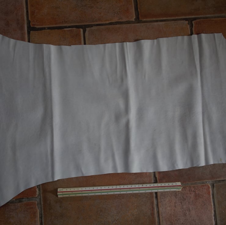 I have a few pieces of this skiver in limited quantities. This is fairly low grade stuff, so I would only recommend using it if you have small pattern pieces and can work around stains and imperfections. Most of these pieces are from the central part of a skin and have variation in thickness from 0.6mm to 1mm. The pieces are approximately 60cm x 30cm (some are more like 40cm x 40cm), and you may receive it either folded in a large letter box or rolled up in a postal tube. It is greyish white in colour, but this can be dyed easily which would hide a lot of the imperfections. It is stretchy and very pliable, a little spongy in places, ideal for miniature work or lining small items.