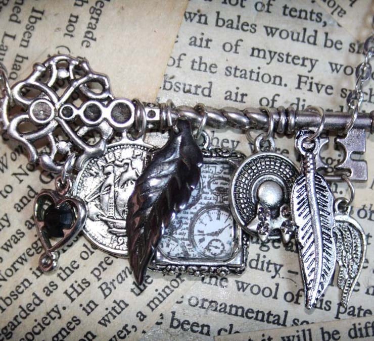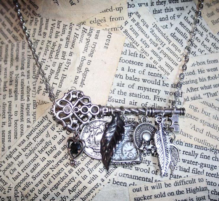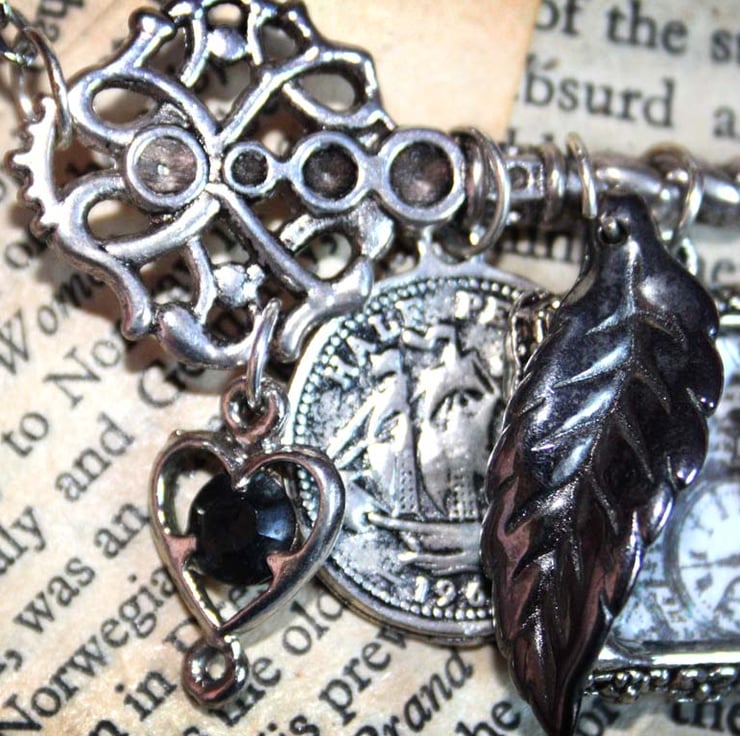 This necklace features a large silver tone key charm. Turned onto its side so that it hangs horizontally, it features an array of charms in silver tones.