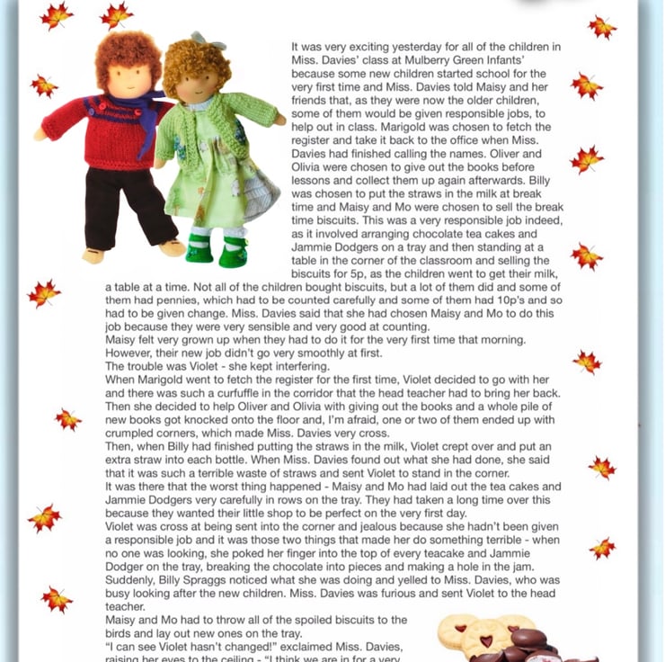 There are other children in Maisy’s class at school - Violet, Billy with his pet rabbit, Amber, Tilly, Rosie and her kittens, Amelia, Ruby, Marigold, Bobby with Max the dog, and the twins Oliver and Olivia, who have a puppy called Oscar. The dolls are all 26cm tall and baby Daisy is 16cm. Maisy and Mo love nothing more than having adventures with their friends. You can read about their adventures on my Facebook and Instagram pages - Maisy Muffin Rag Dolls and on my Mulberry Green Pinterest boards.