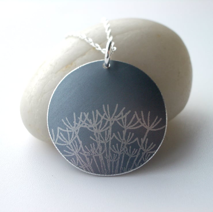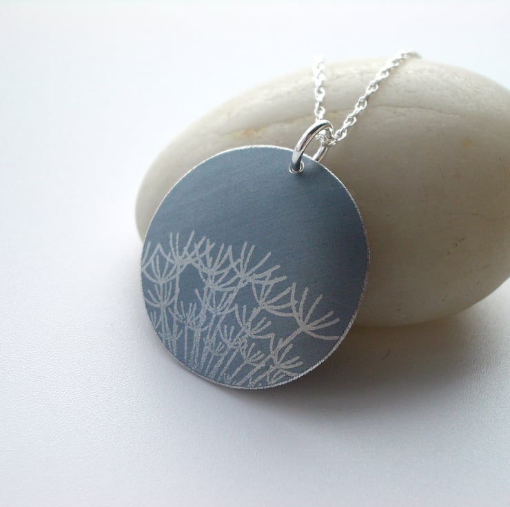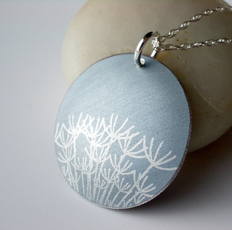 This simple pendant is hand made from aluminium which I have dyed a delicate silvery grey and printed with a pretty dandelion seed heads design. I saw pierce by hand the disc shape and dome it so that it catches the light.