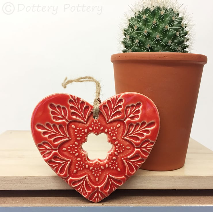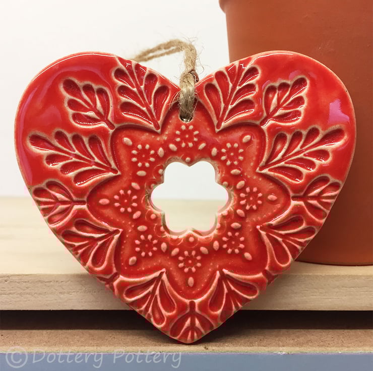 This listing is for a ceramic heart decoration. It is made from white earthenware clay, imprinted with pattern and finished with a bright, glossy glaze. It has been fired twice, once to the bisque stage and then a second firing for the glaze. It measures 7.5 centimetres wide and the same in height x 5mm thick. It can be hung outside.
