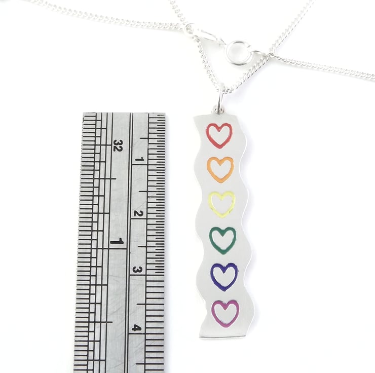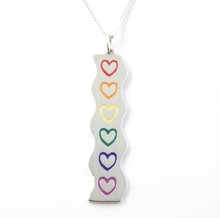 This rainbow heart pendant has been lovingly handcrafted in the UK. It is made from sterling silver sheet and is etched before being drilled and cut out by hand, the edges are then smoothed using files and emery paper. A jump ring is then attached and soldered on. Coloured resin based enamels are added to the etched hearts and then the piece is then polished.