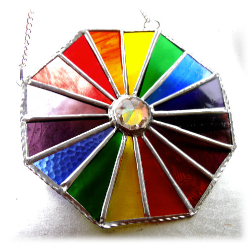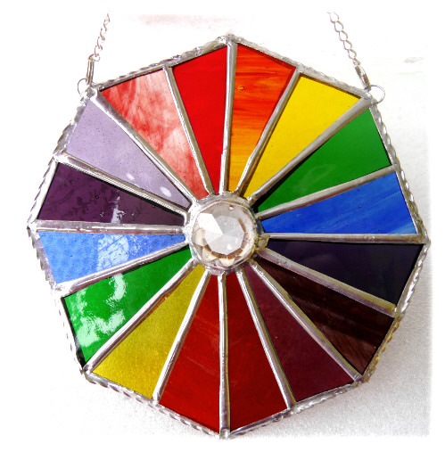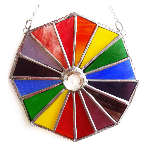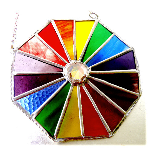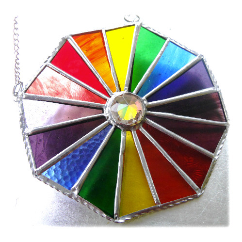 This is a stained glass suncatcher made using the Tiffany copper foil technique.