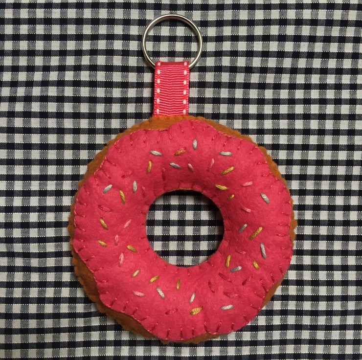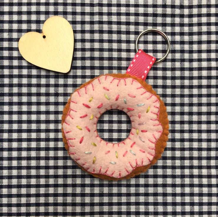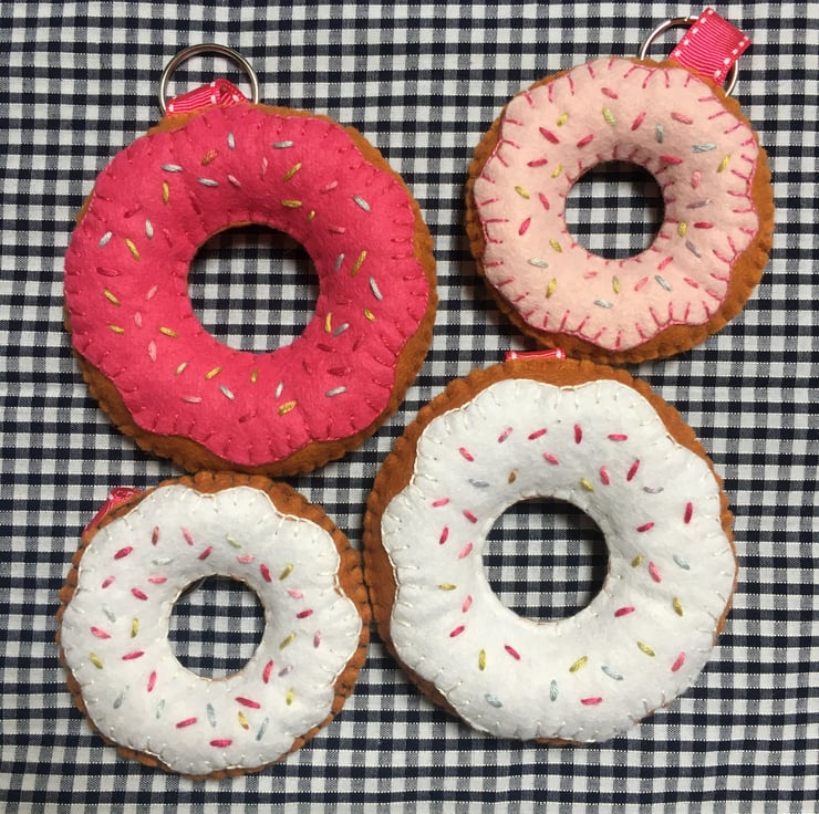 The doughnuts are made from blended wool felt. Sprinkles have been hand stitched with embroidery thread, and finished with a pink ribbon and metal keyring.