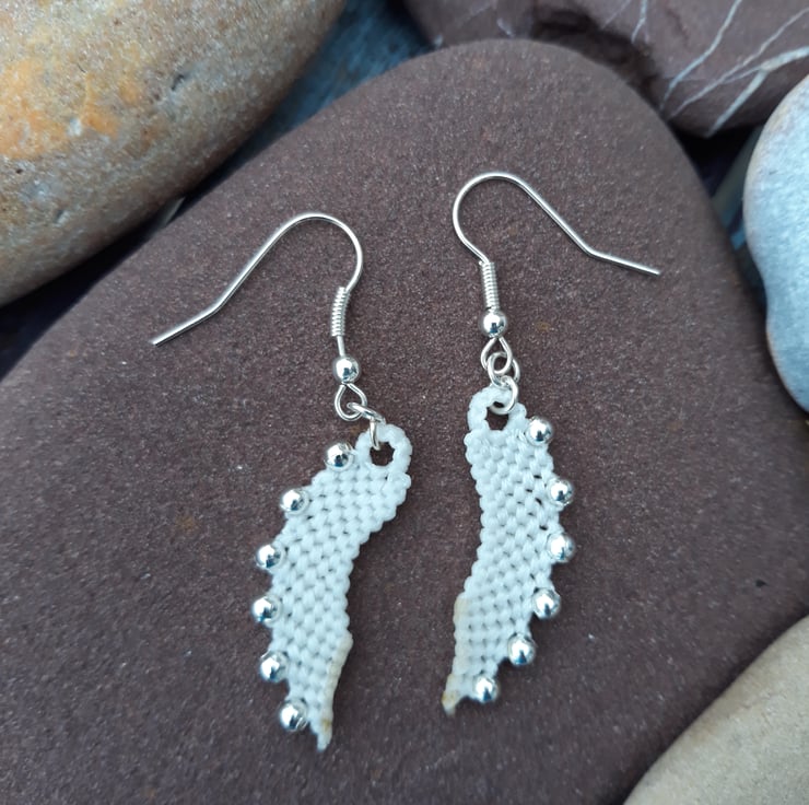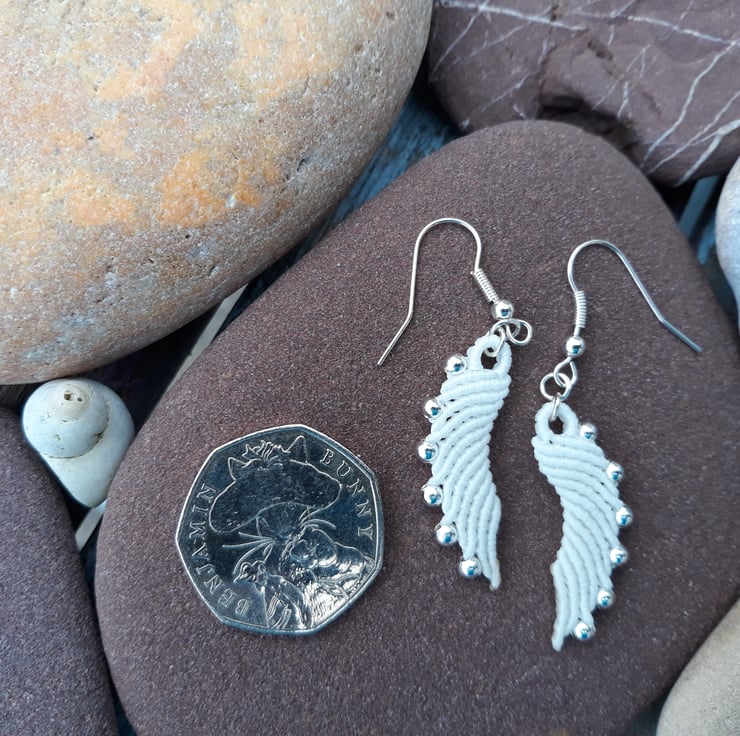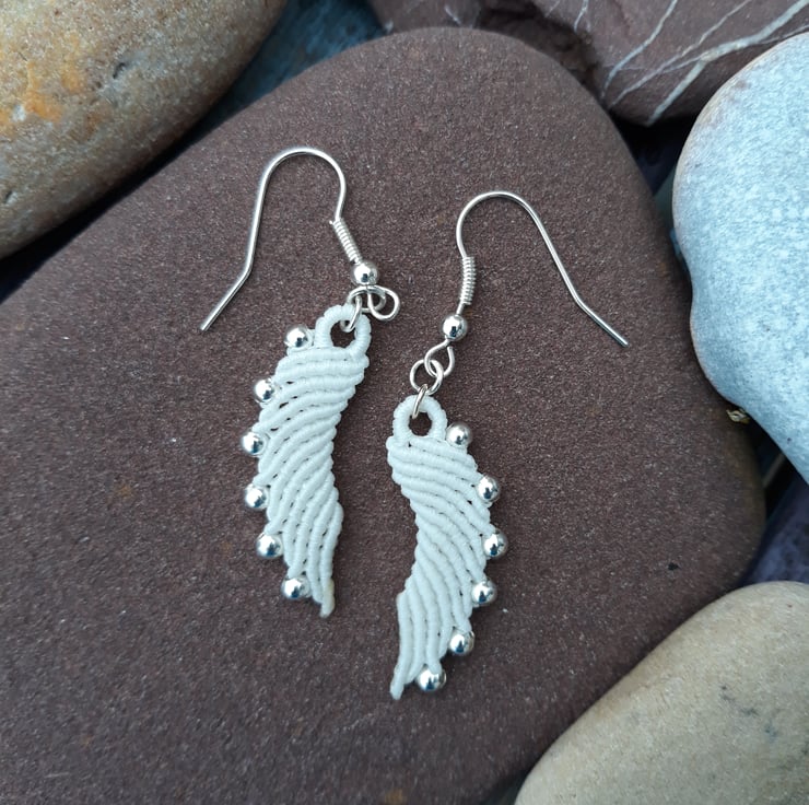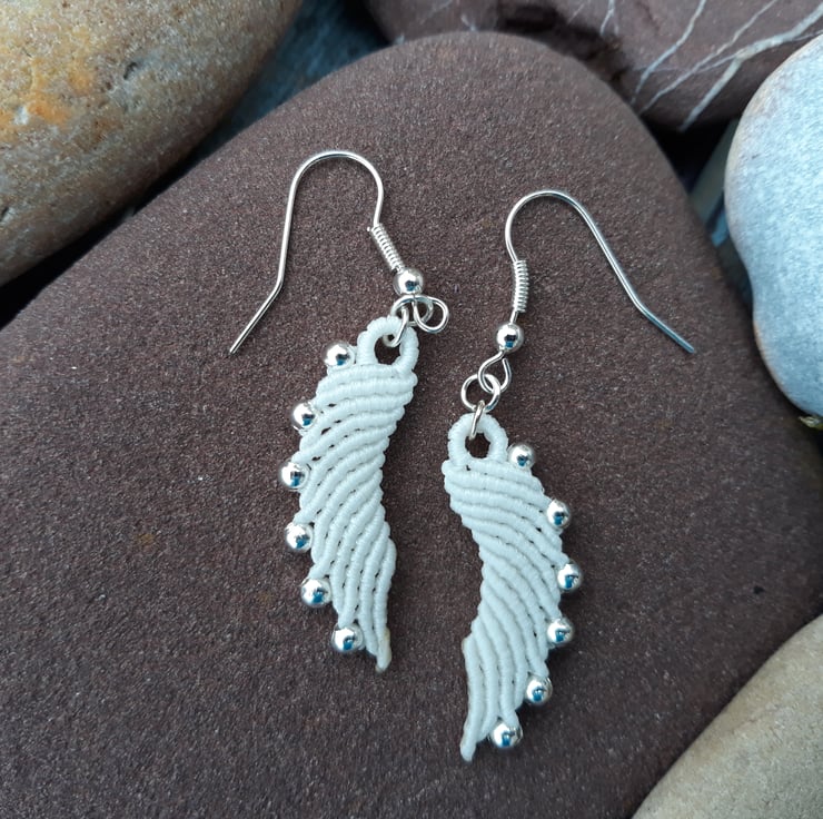 These white angel wing earrings are made from polyester waxed thread. They measure at 3.6cm. The beads are silver plated and the fish hooks are silver plated.