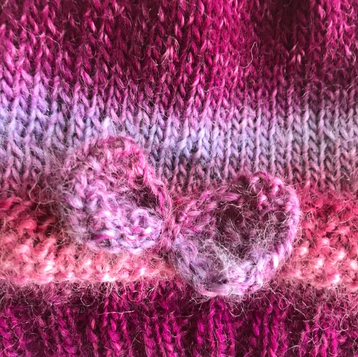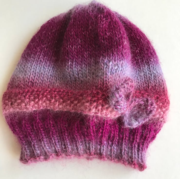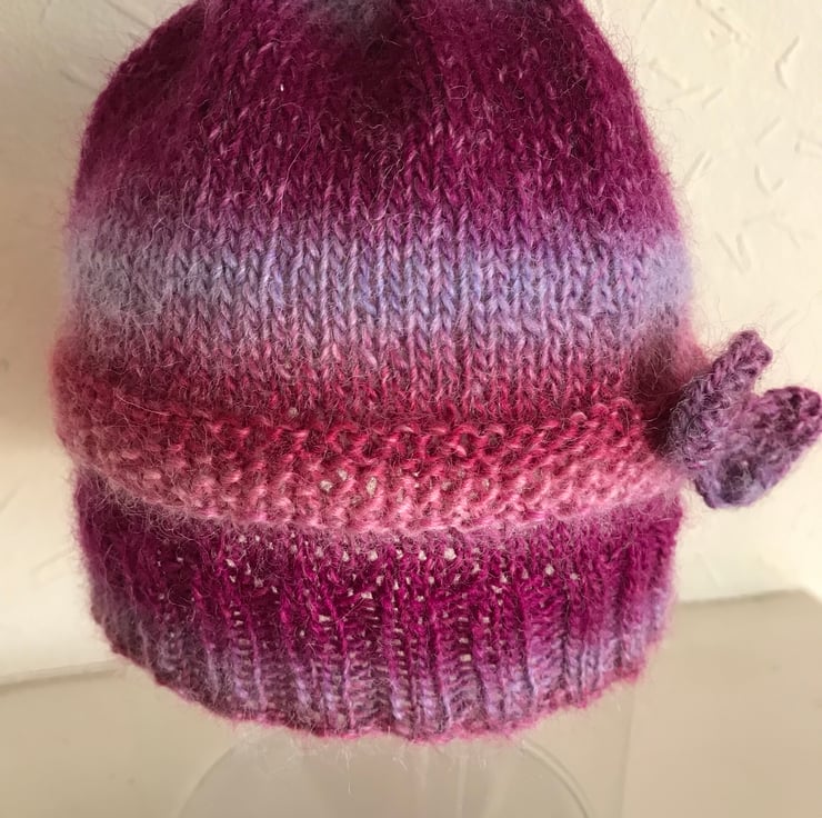 A hand knitted baby hat worked in a self striping yarn. The colours range from pink to magenta to lavender. The hat features a mock band in moss stitch with a small knitted bow attached.