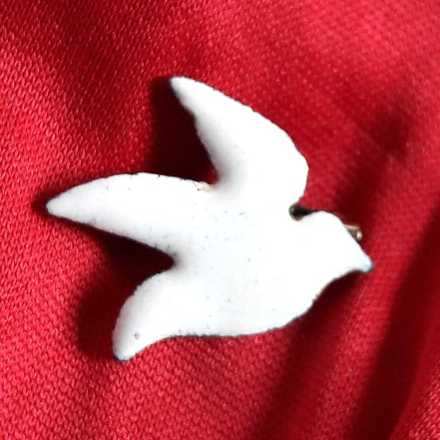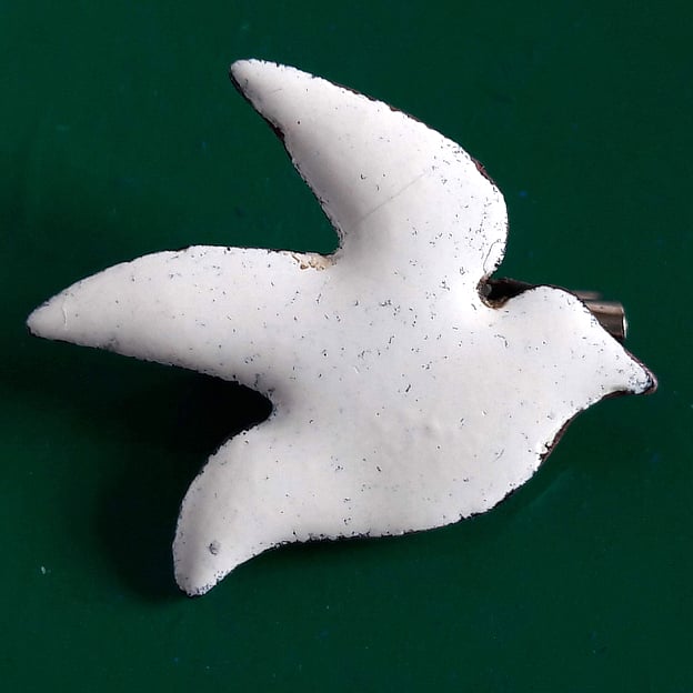A white dove, measuring 28mm by 25mm. It is mounted on a 20mm brooch bar, soldered to the copper base.