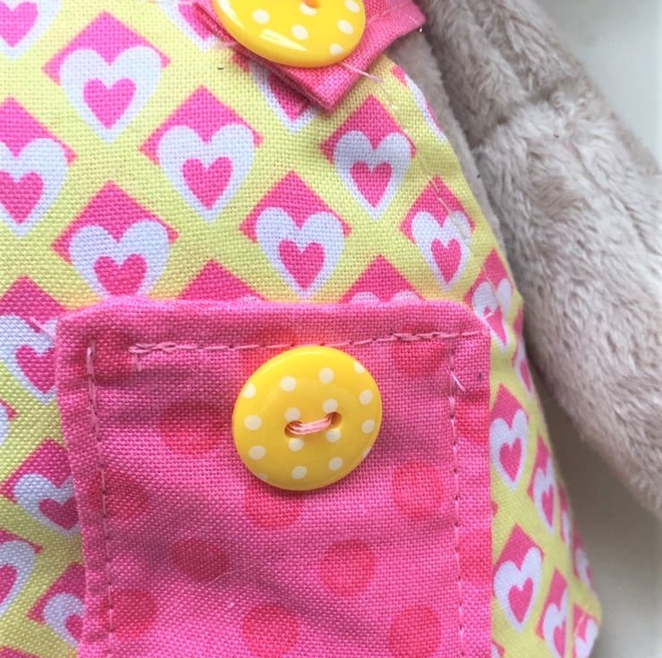 She is made from a soft plush fabric, with jointed arms which move, safety eyes and a hand stitched nose. Her dress is made from the best quality cotton fabric, with a little pocket and trimmed with matching buttons. Firmly stuffed with polyester fibrefill and conforms to CE safety regulations.