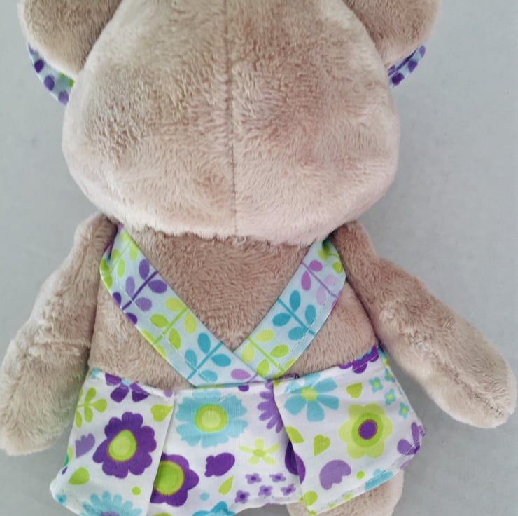 Cute little teddy bear, dressed in her favourite pinafore dress with matching bows on her ears.