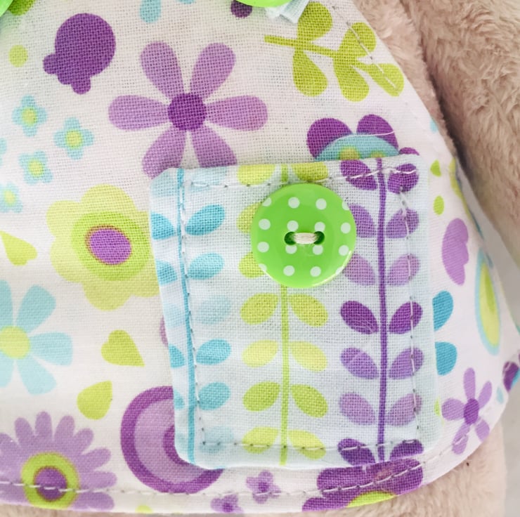 She is made from a soft plush fabric, with jointed arms which move, safety eyes and a hand stitched nose. Her dress is made from the best quality cotton fabric, with a little pocket and trimmed with matching buttons. Firmly stuffed with polyester fibrefill and conforms to CE safety regulations.