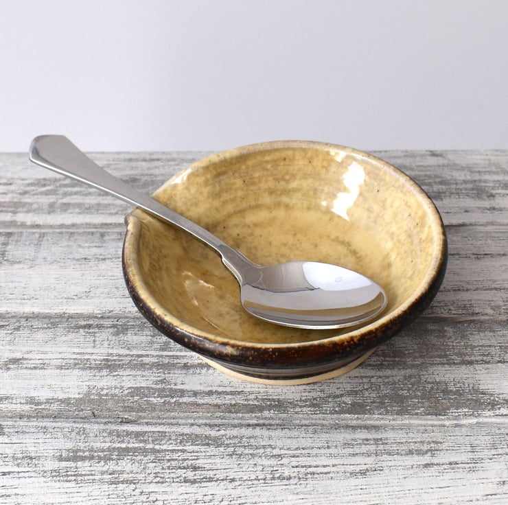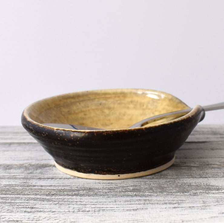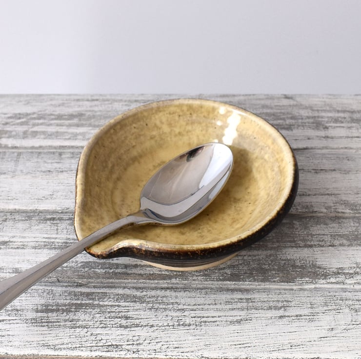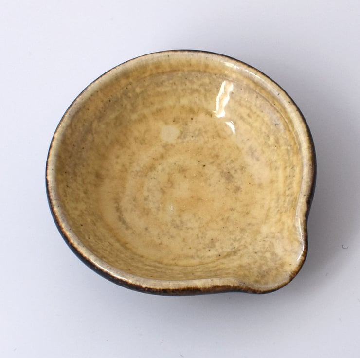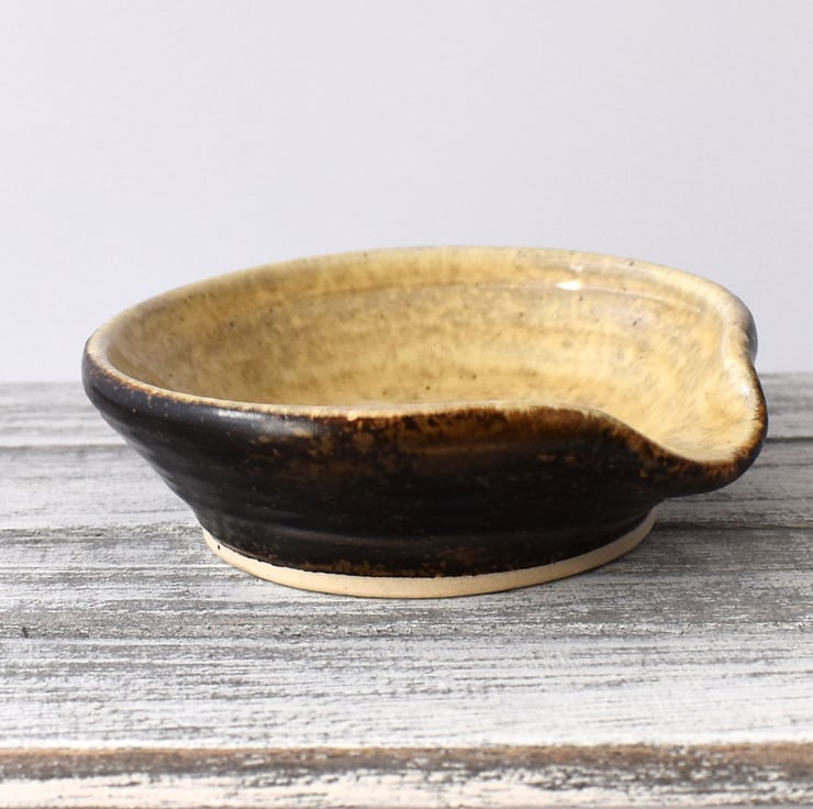 Wheel thrown handmade pottery tea bag receptacle or tea spoon rest in beige/oatmeal and brown glazes.