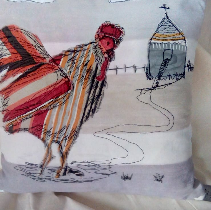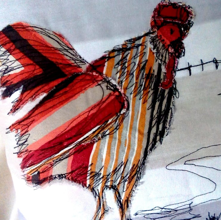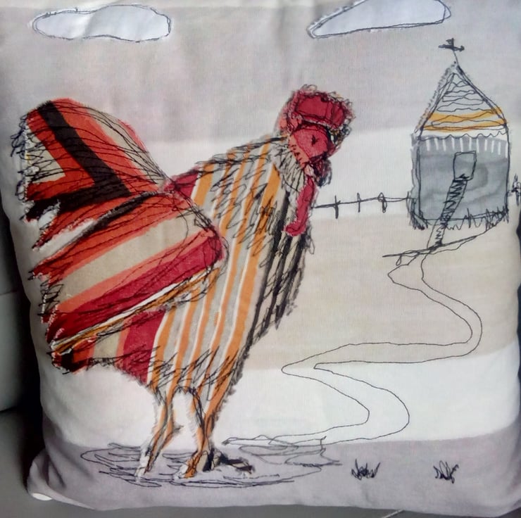 The Clever Hen design cushion cover with freestyle machine embroidery appliqued raw edge design, the background fabric is a broad striped linen type fabric it has same fabric on reverse with zip closure for easy access.