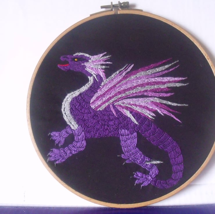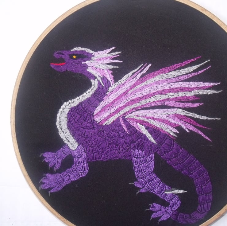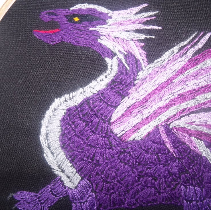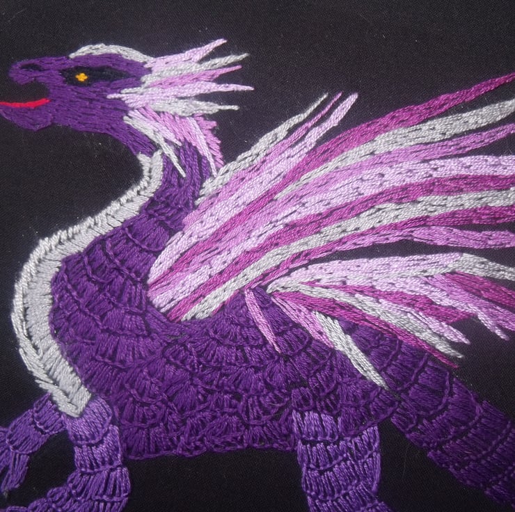Here is a baby dragon, embroidered on black calico in a mixture of purple, silver and pink thread.