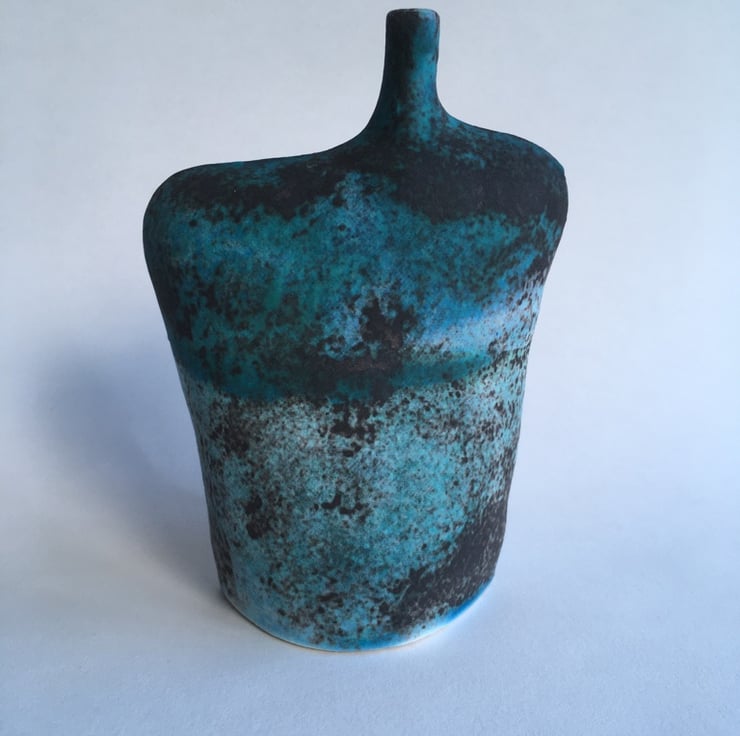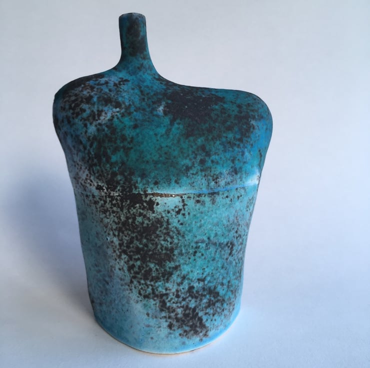 A hand built stoneware ceramic bottle featuring a lichen on stone inspired glaze application. An ideal gift for someone who loves the natural world.