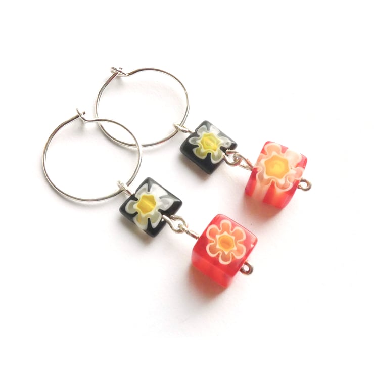 Sterling silver handmade sleepers with blood orange cube and black millefiori flat square glass beads both measuring 7mm.