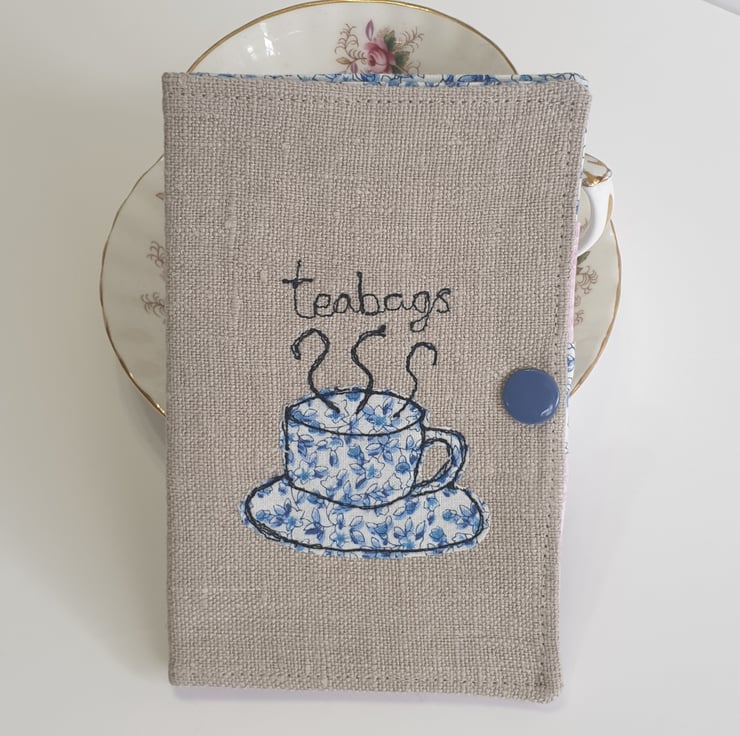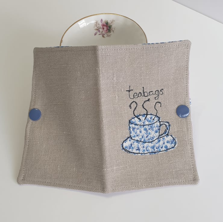 The outer case is made from lovely quality vintage linen. A cute little teacup and saucer is appliqued on the front using ditsy floral cotton fabric and free motion embroidery. The word "teabags" is embroidered onto the front. It is interfaced to give stability and strength.