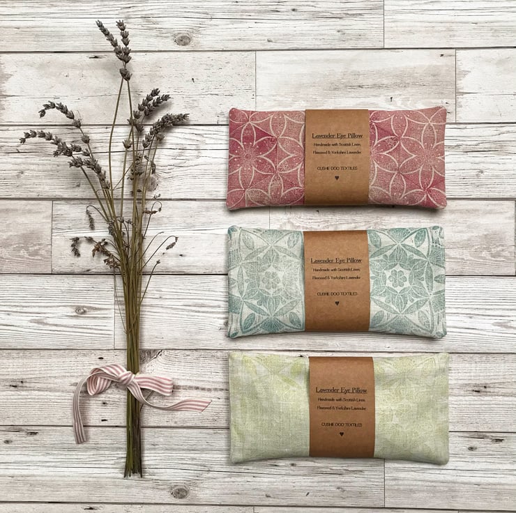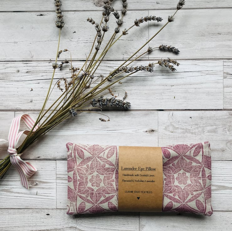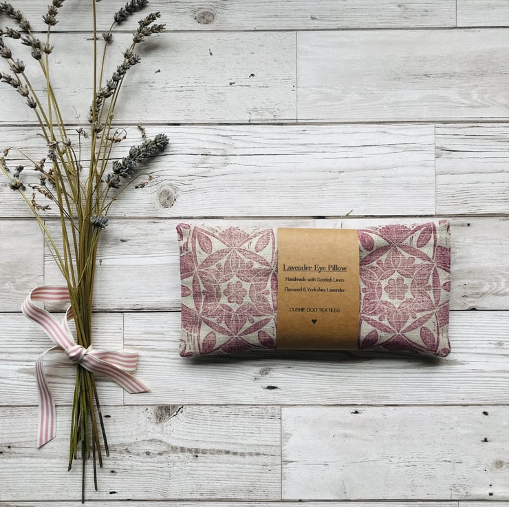The interior pillow is made from natural calico and filled with Flax seeds for gentle acupressure and to block out light. The fragrance of the Yorkshire Lavender flowers can help to relieve tension and stress