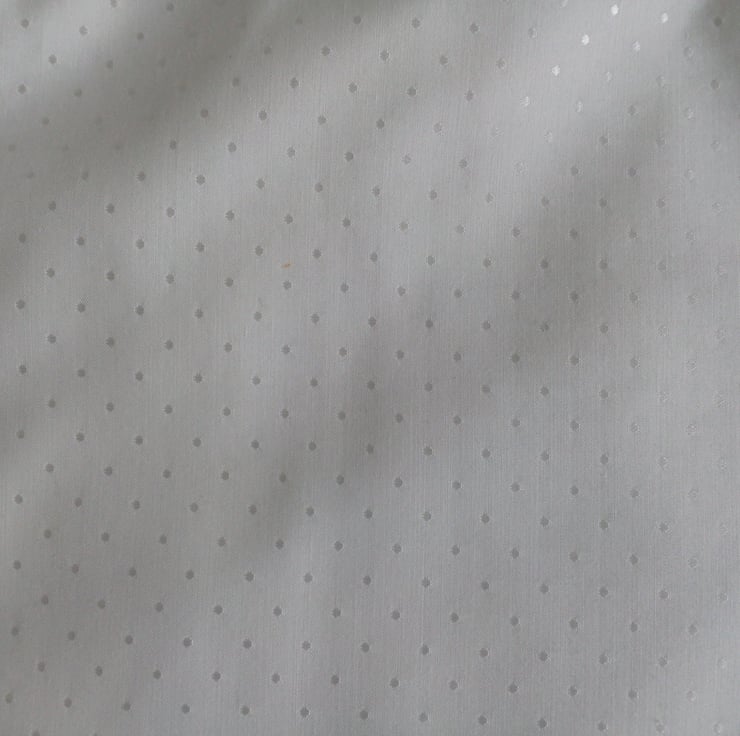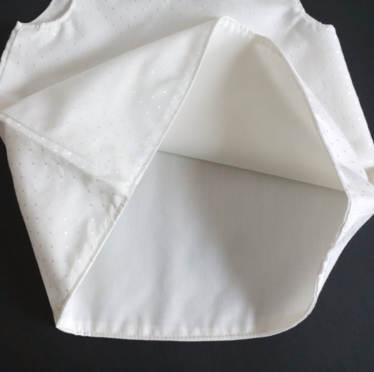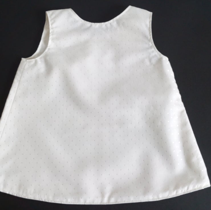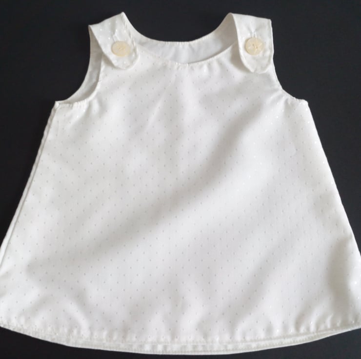 A Lined, A line style dress/pinafore in a cream dotty design fabric. Fully lined. Ideal for a Summer Christening or Wedding.